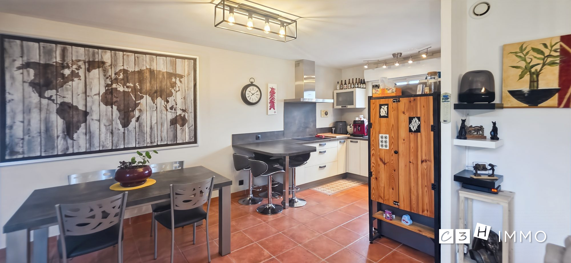 ...Le rez-de-chaussée propose une cuisine séparée, un espace repas et une grande pièce de vie...