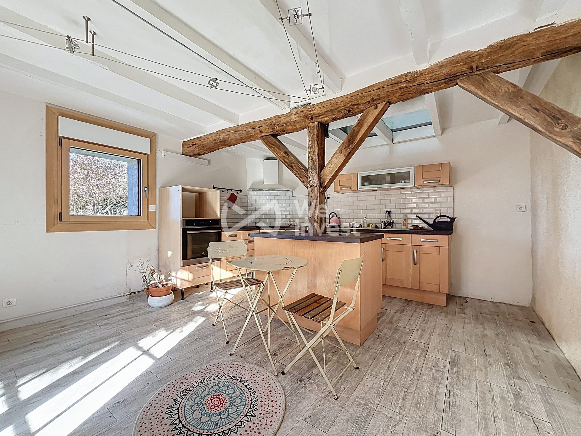 ...Elle séduit par le cachet de l'ancien – murs en pierre apparente, poutres, cheminée avec insert...
