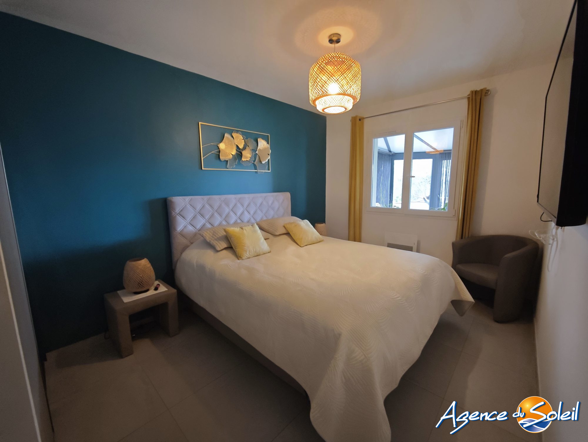 ...L'entrée dessert une belle pièce de vie climatisé de 45 m², le coin nuit offre deux chambres...