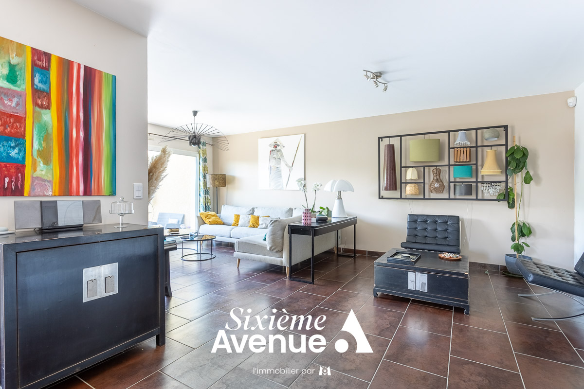 ...Salon séjour exposé Est avec de grandes baies vitrées offrant une belle vue sur l'extérieur...