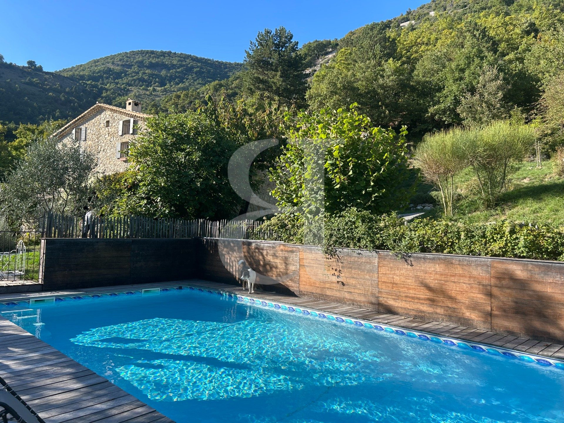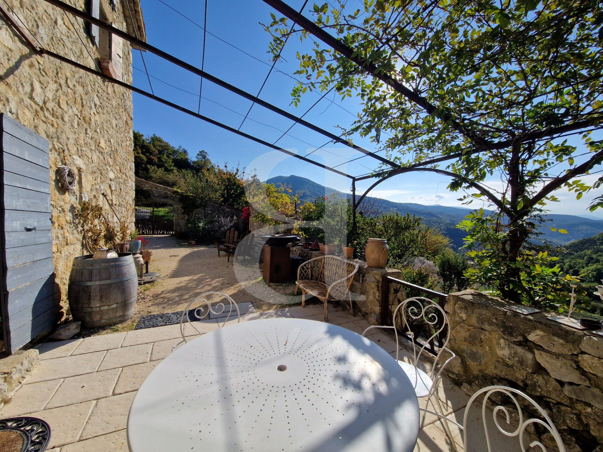 ...Vue spectaculaire, piscine (12x5m), oliveraie et jardin d'artiste avec fontaine, arbres...