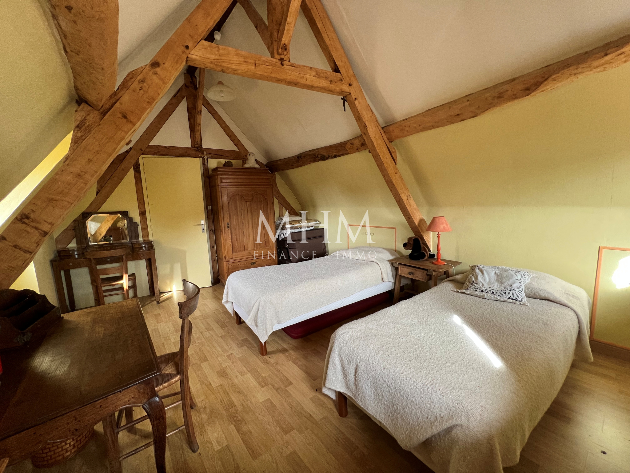 ...Deux chambres se trouvent au premier étage, et une troisième chambre se trouve au deuxième étage...