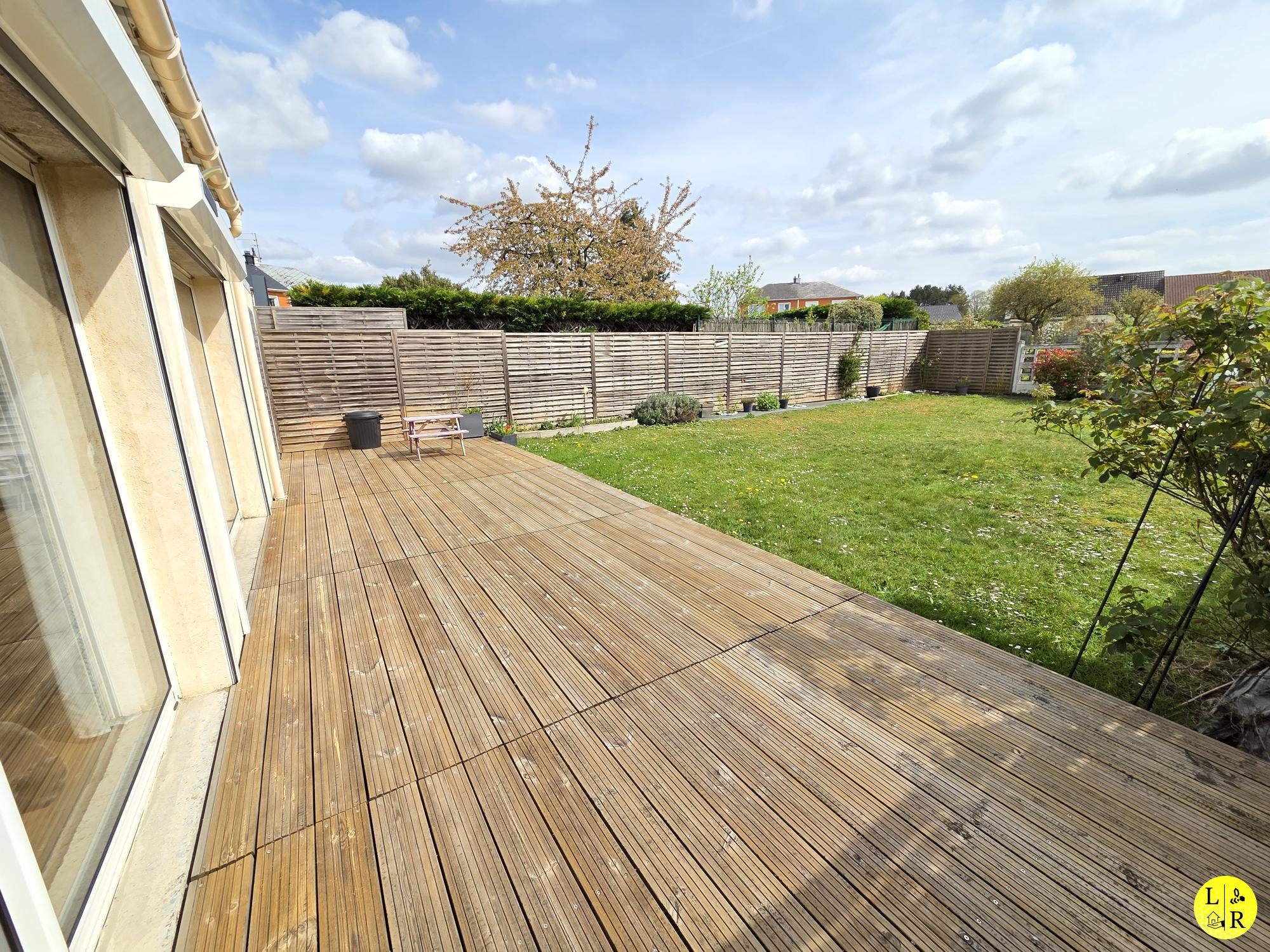 ...De la pièce de vie, on a accès à une grande terrasse surélevée en bois donnant sur un beau jardin...