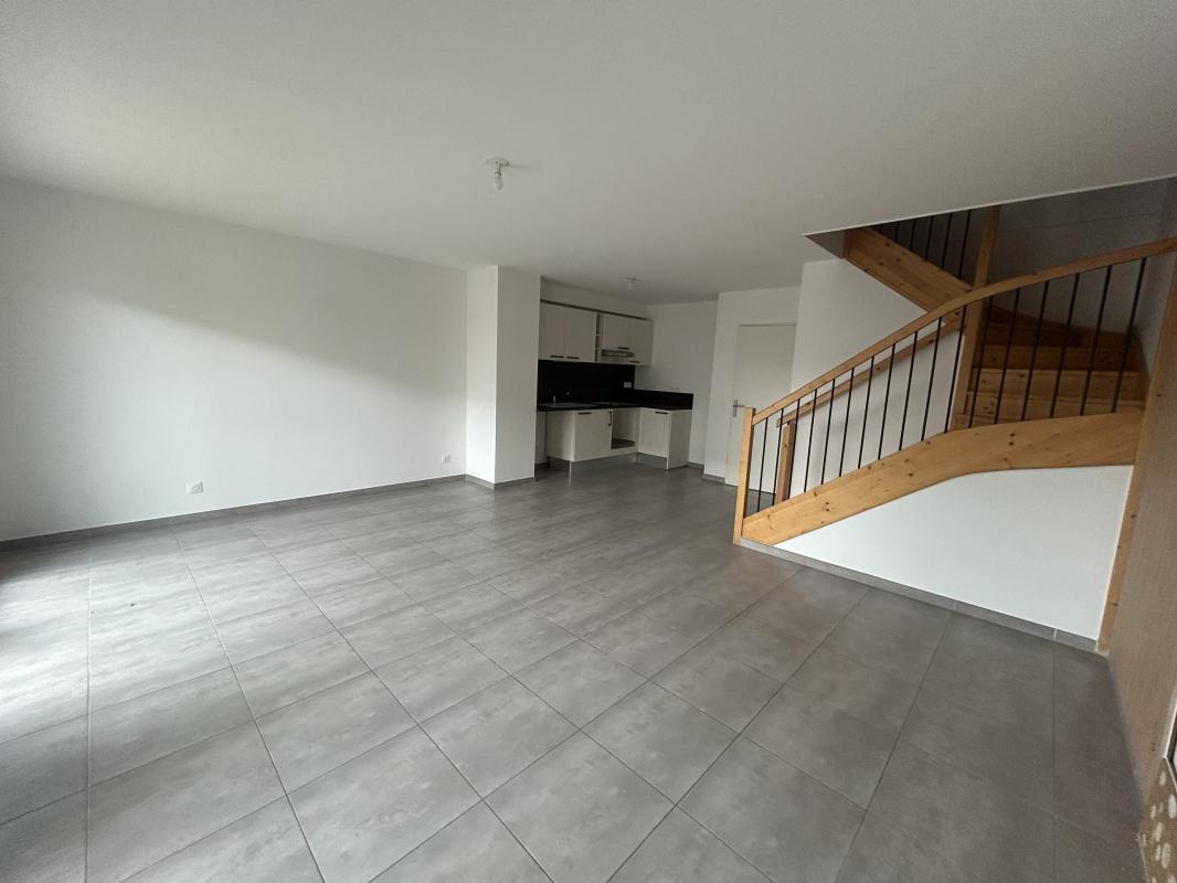 ...Au Rdc, vaste séjour plafond rampant aux belles poutres apparentes, cuisine ouverte équipée...
