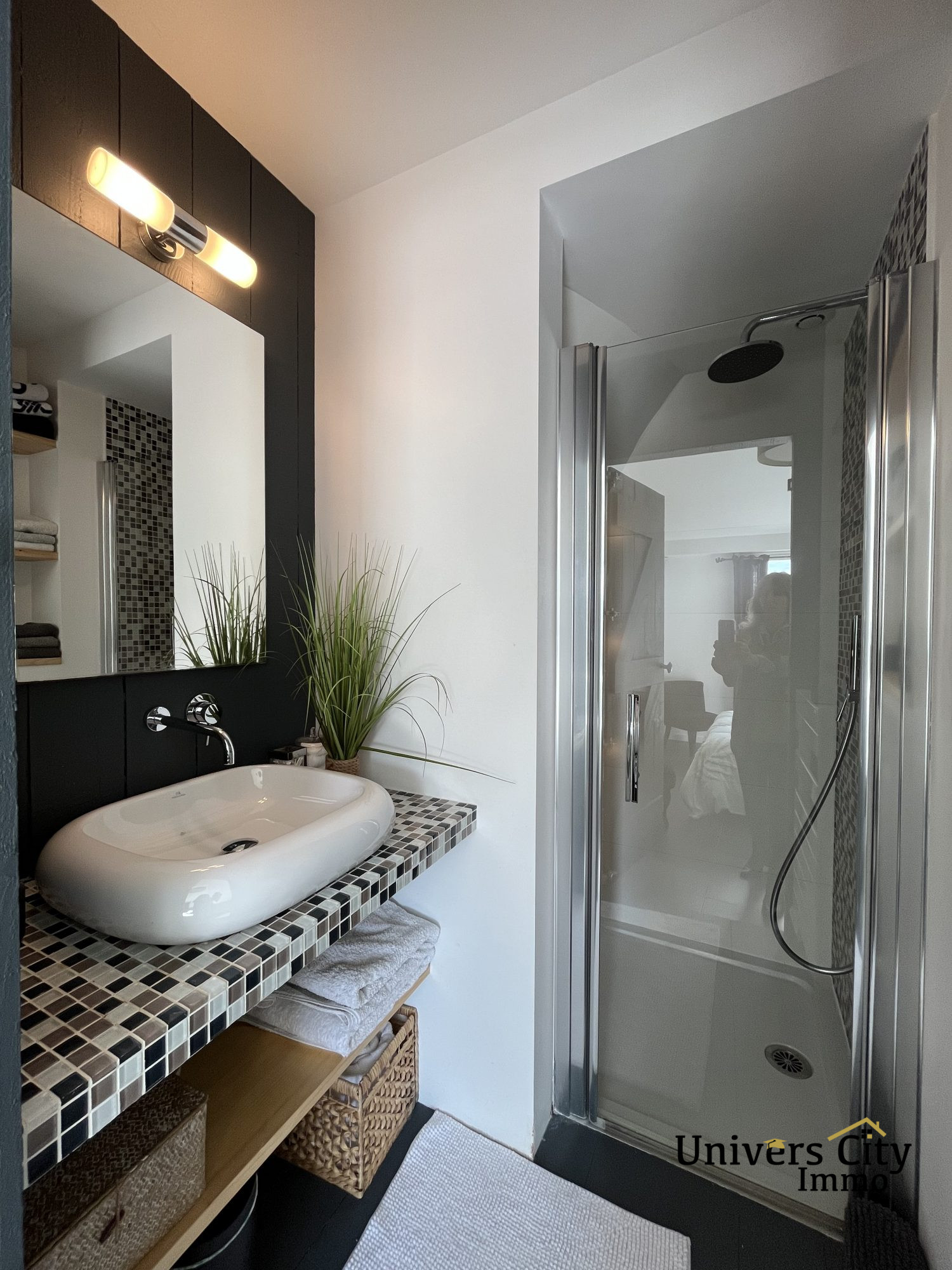...A l'étage : une très grande mezzanine d'environ 34 m2 au sol, deux chambres et une salle d'eau...