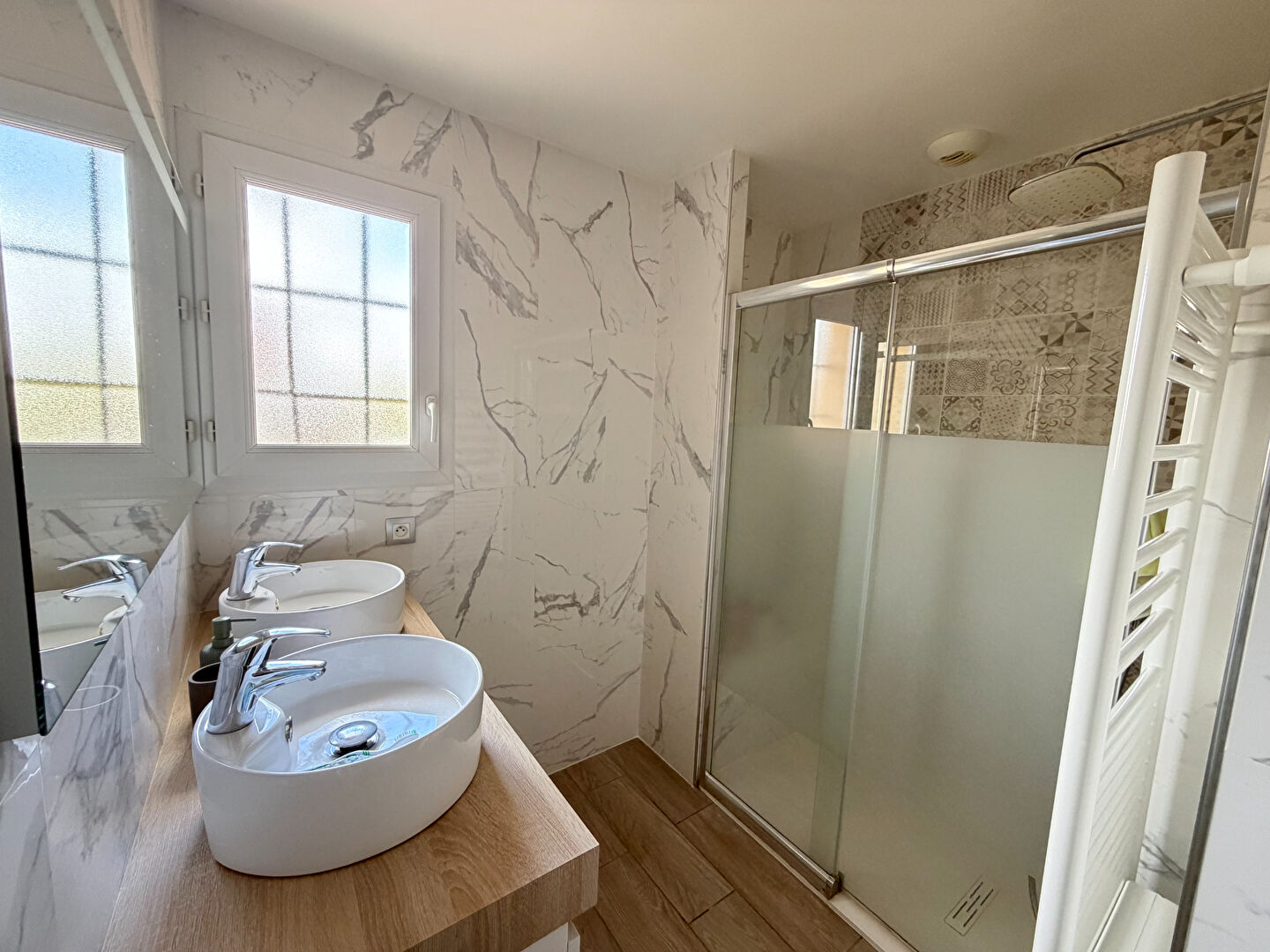 ...Au premier niveau : l'entrée dessert la cuisine et un grand double séjour de 29m2...