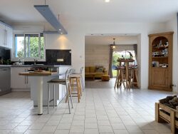 ...Le salon cathédrale baigné de lumière, s'ouvre sur une terrasse bois et un jardin paysager avec...