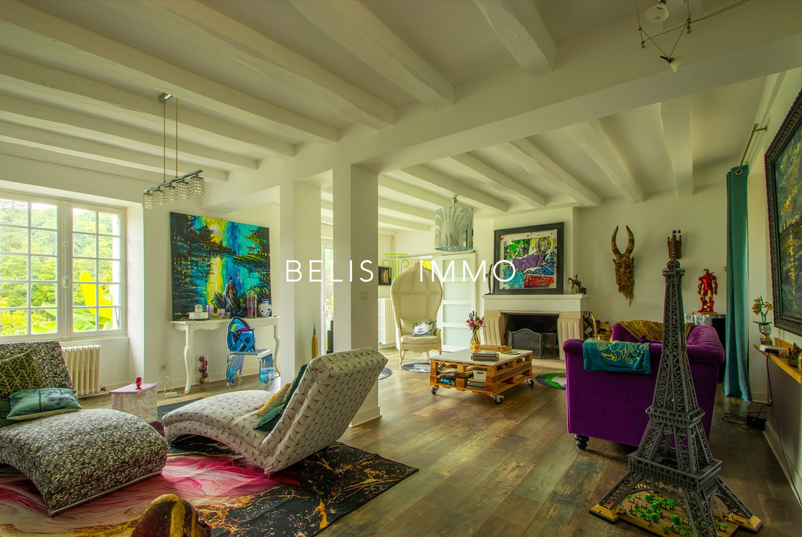 ...Au rez-de-chaussée : un vaste salon de 42 m² agrémenté d'une cheminée, une cuisine...