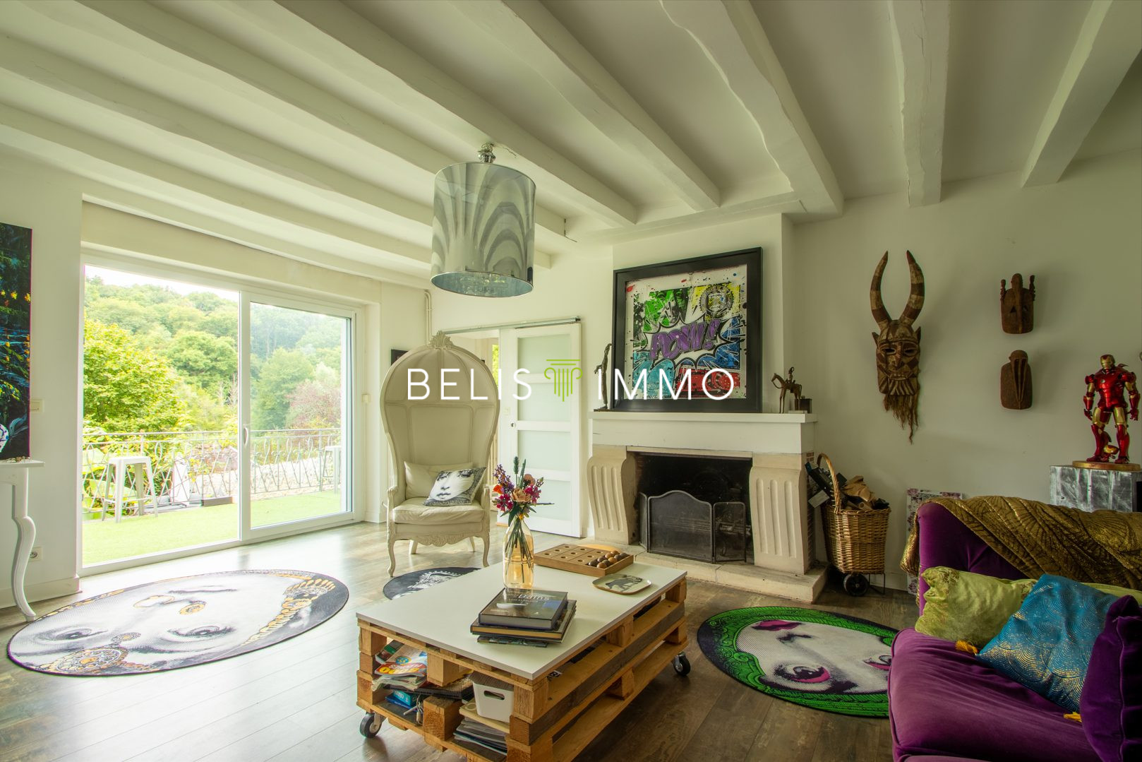 ...Au rez-de-chaussée : un vaste salon de 42 m² agrémenté d'une cheminée, une cuisine...