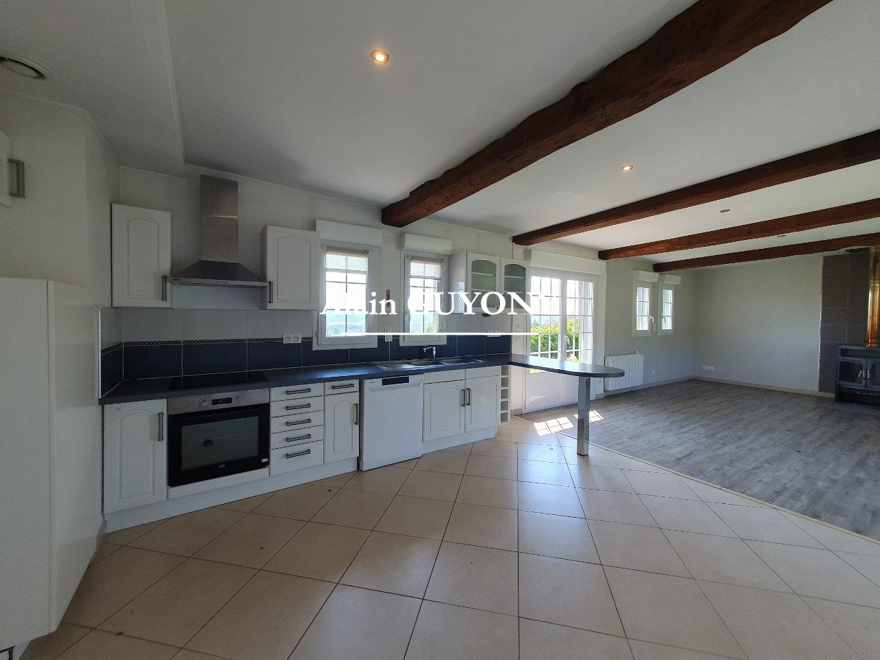 ... séjour - salon lumineux équipé d'un poêle à granulés, une cuisine aménagée et équipée ouverte sur l...