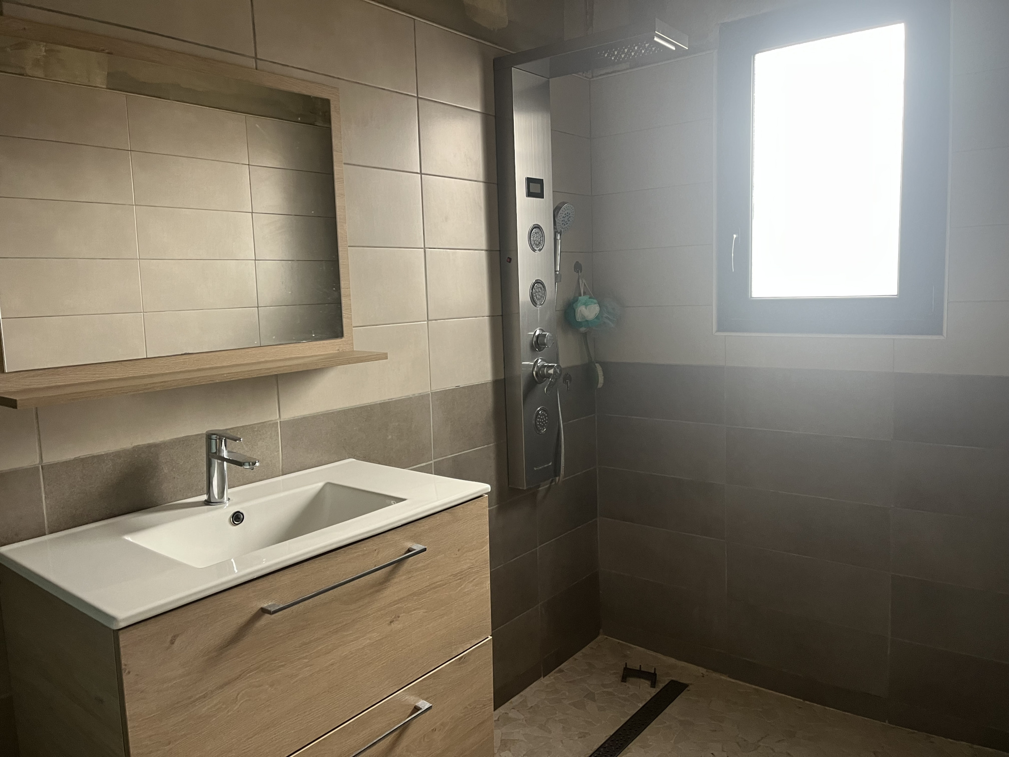 ...Au rez-de-chaussée : un séjour avec cuisine ouverte, une salle de bains, et une buanderie...