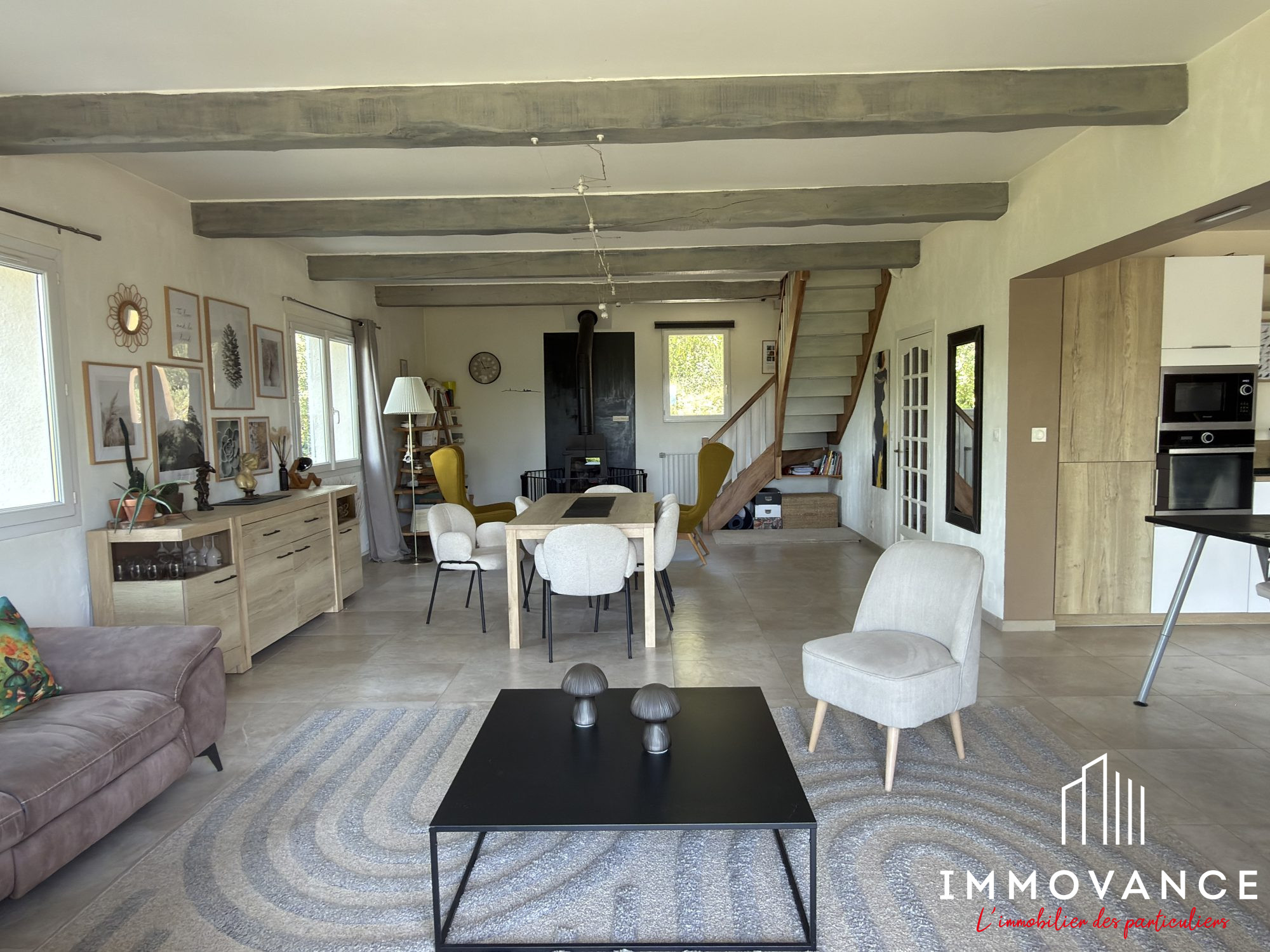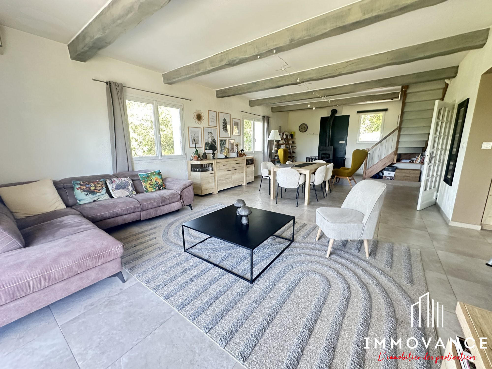... : un vaste séjour lumineux de plus de 50 m² équipée d'un poêle avec de grandes baies vitrées avec ...
