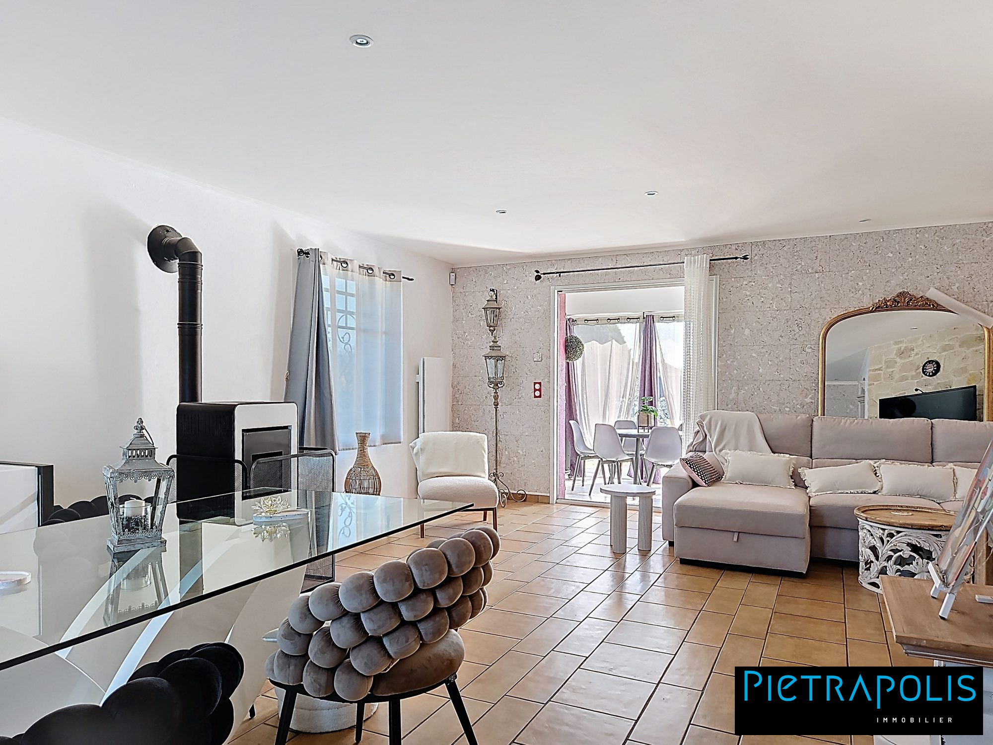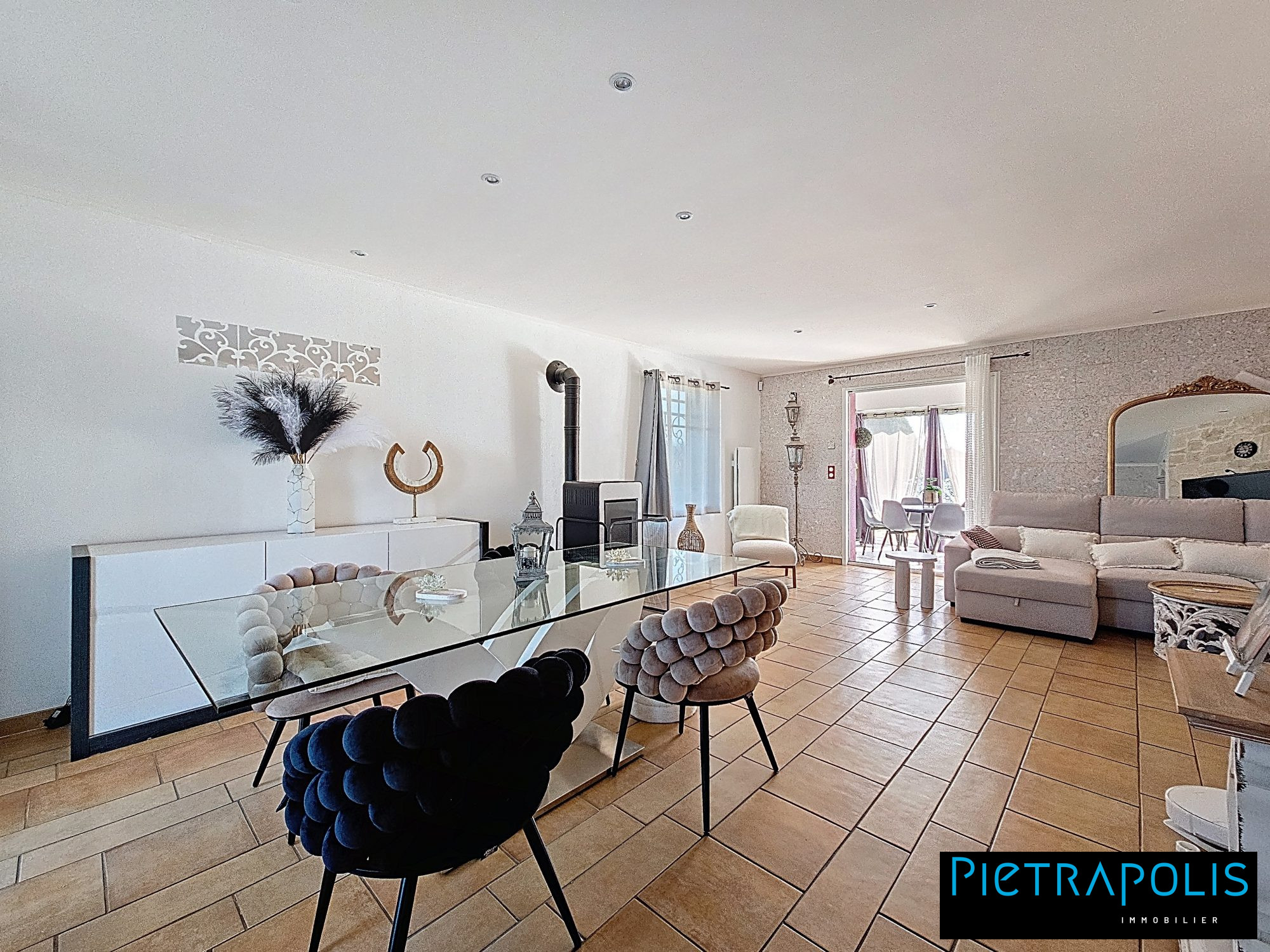...De plain-pied, l'espace à vivre spacieux dispose d'une cheminée à foyer fermé, offrant une...