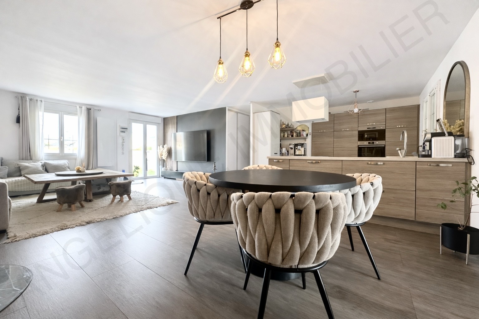 ...Dès l'entrée, la cuisine moderne, entièrement équipée et aménagée, s'intègre harmonieusement à...