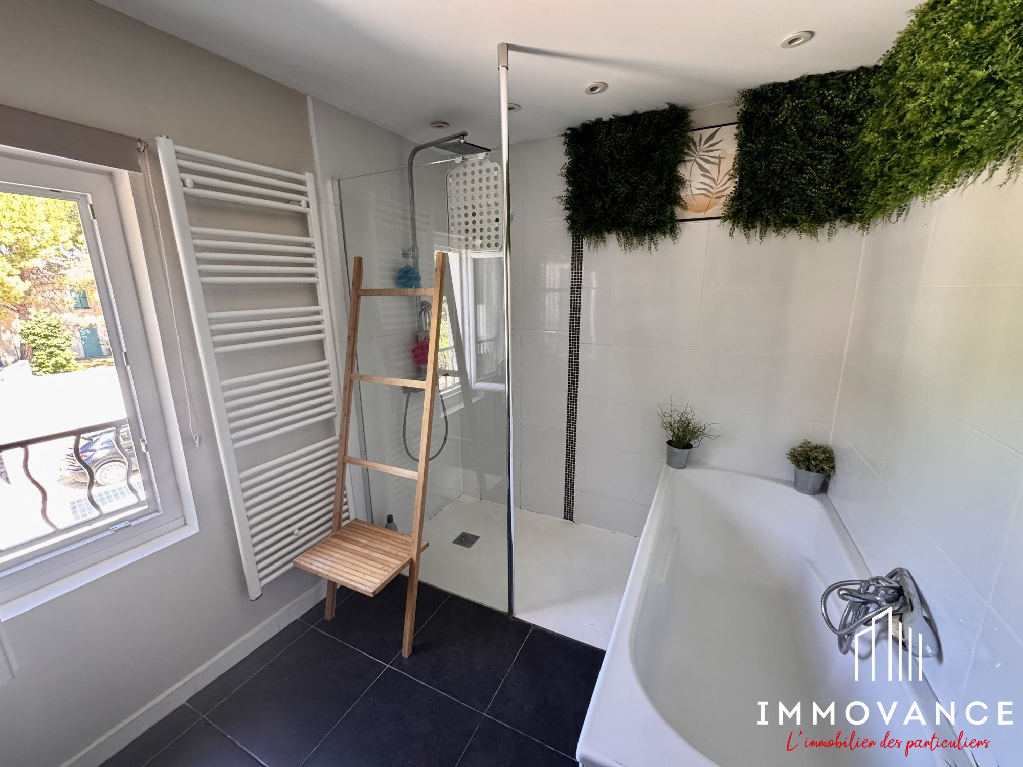 ...Elle est composée au rdc, d'une suite parentale, douche et baignoire, WC séparé, d'une pièce...