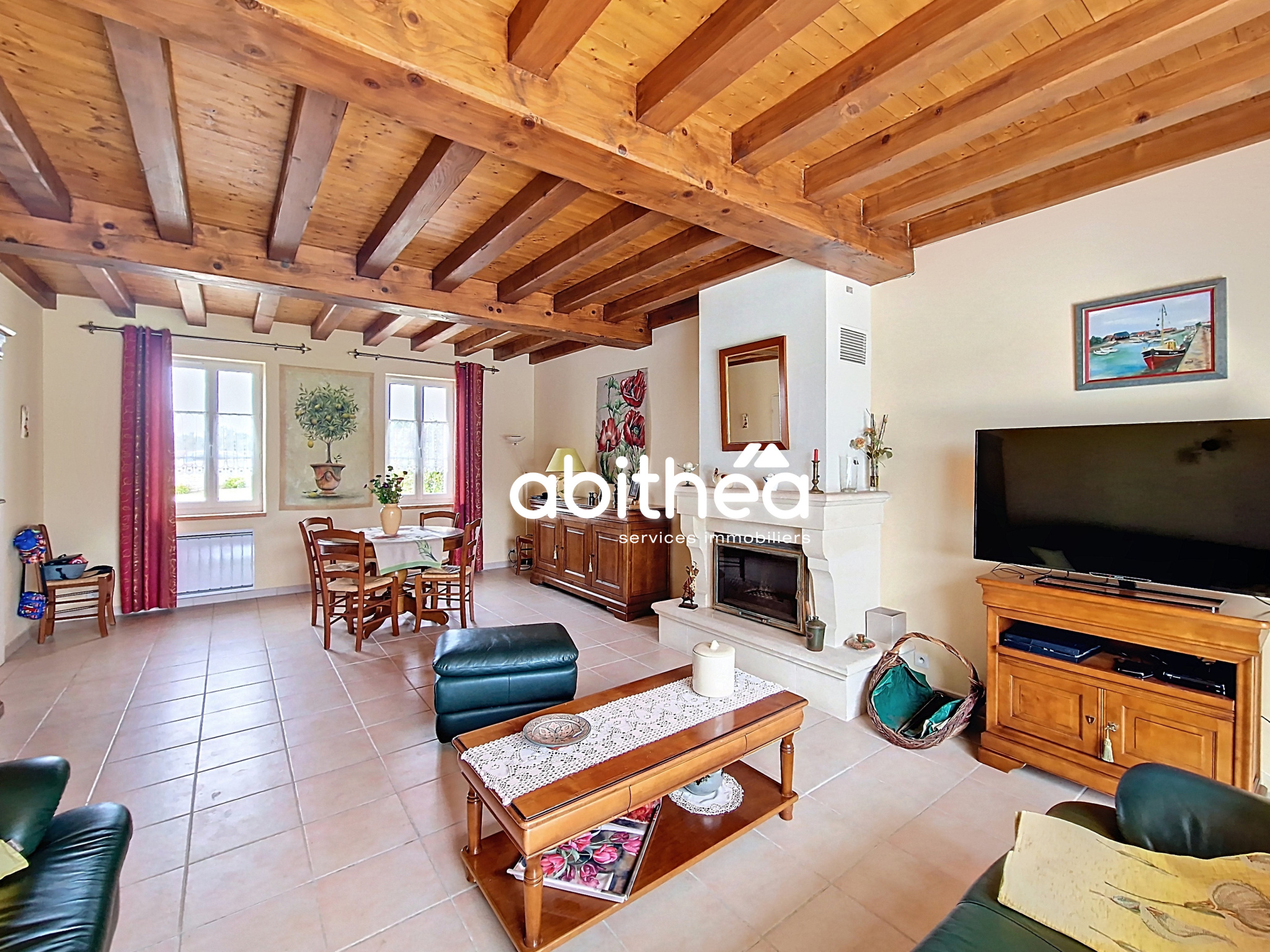 ...Cette maison comprend au rez-de-chaussée : une pièce de vie exposée Sud avec cheminée, une...