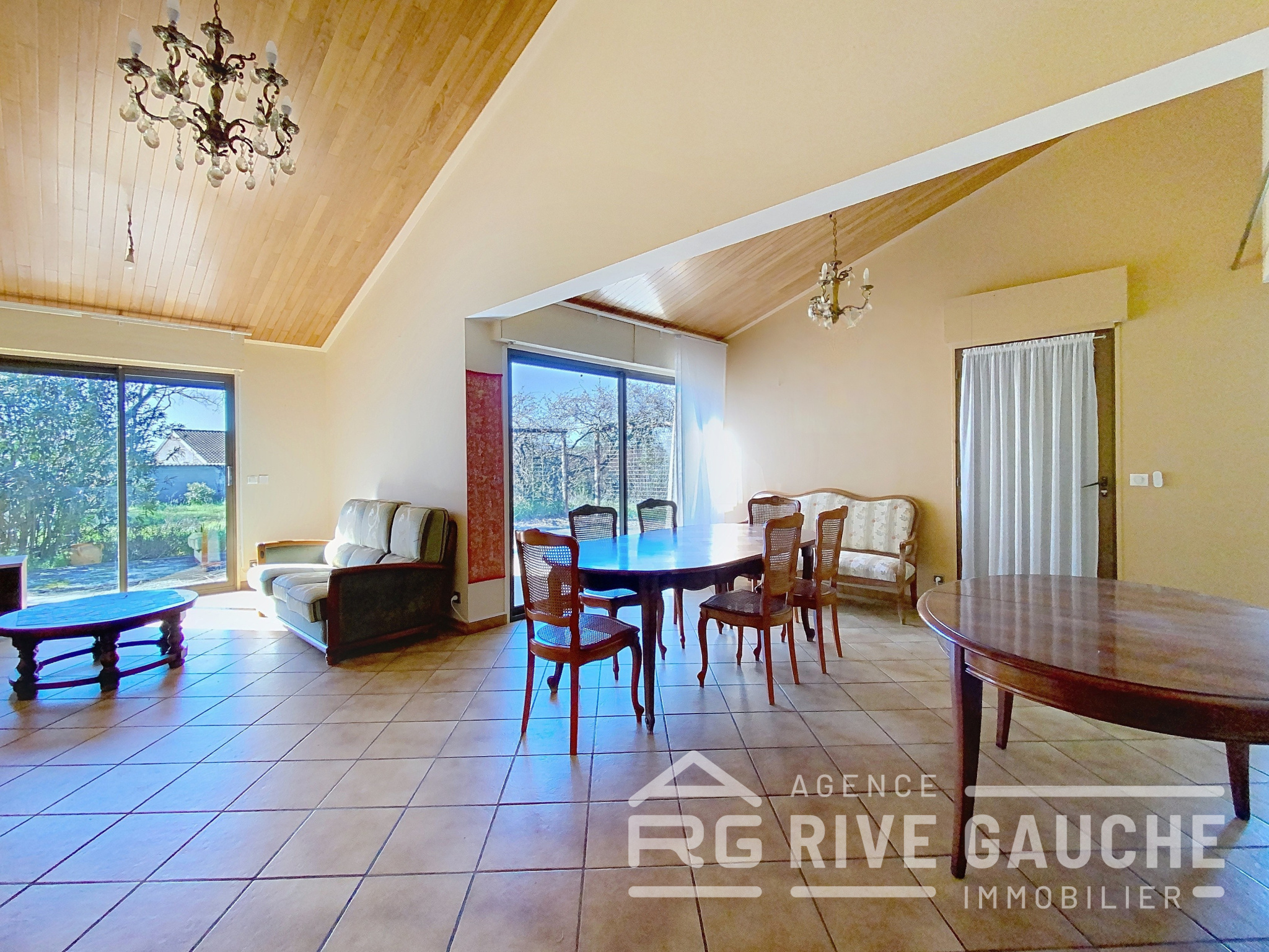 ...Au rez-de-chaussée :- Pièce de vie lumineuse avec plafond cathédrale et cheminée à foyer fermé-...
