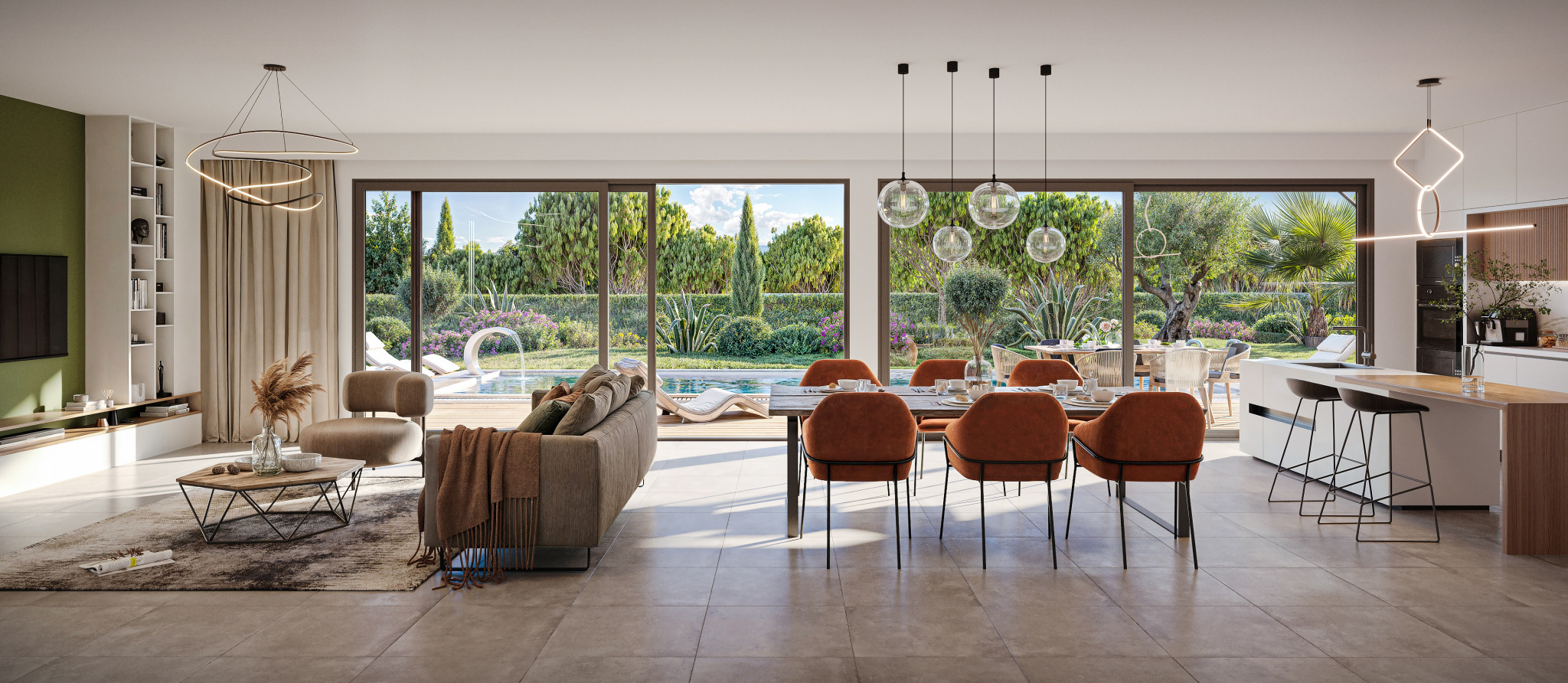 ...Dès l'entrée, la pièce de vie séduit par son atmosphère baignée de lumière...