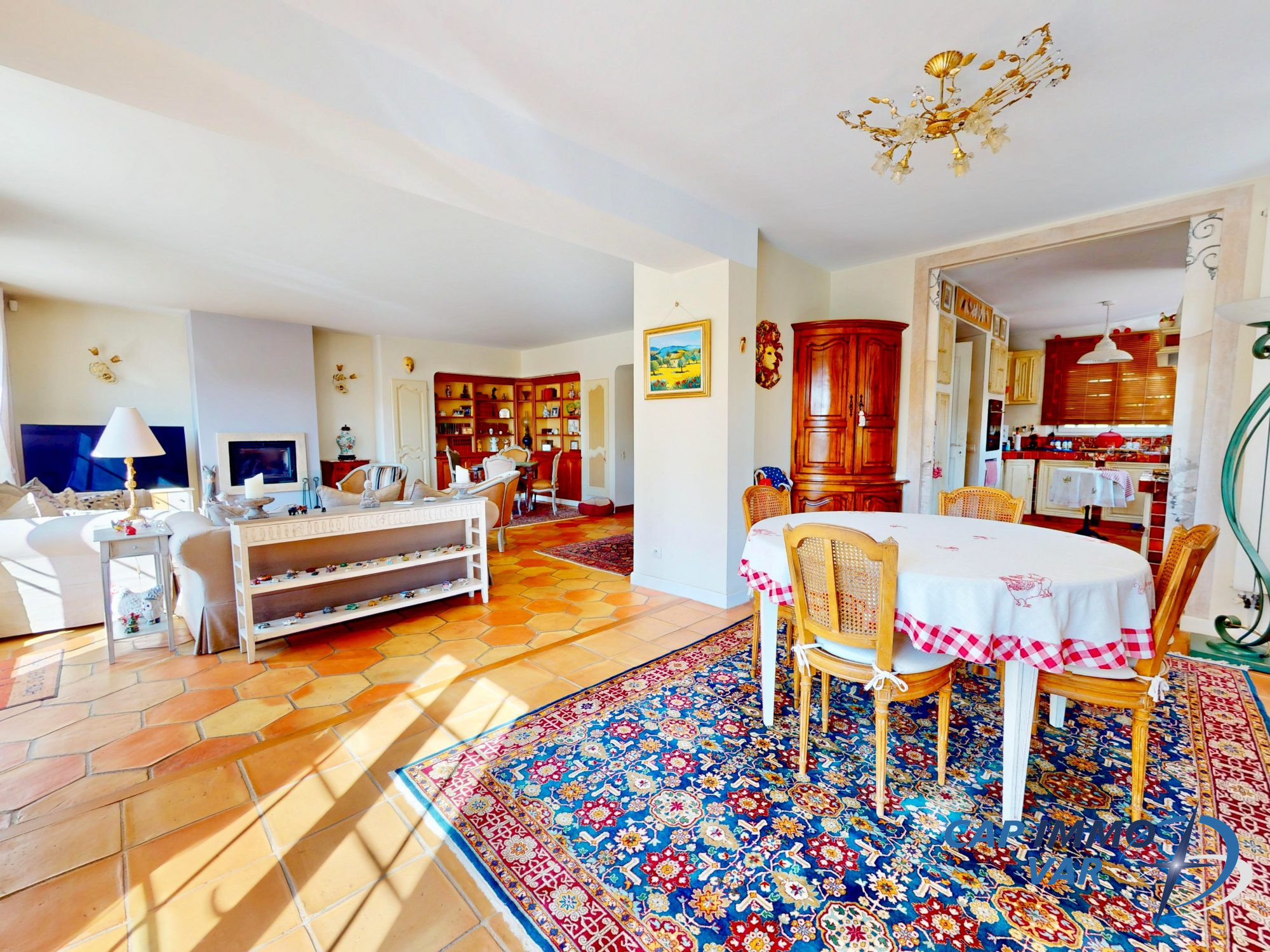 ...Le séjour de 58m2 intégrant la cuisine équipée US avec son piano est ouvert sur une festive...