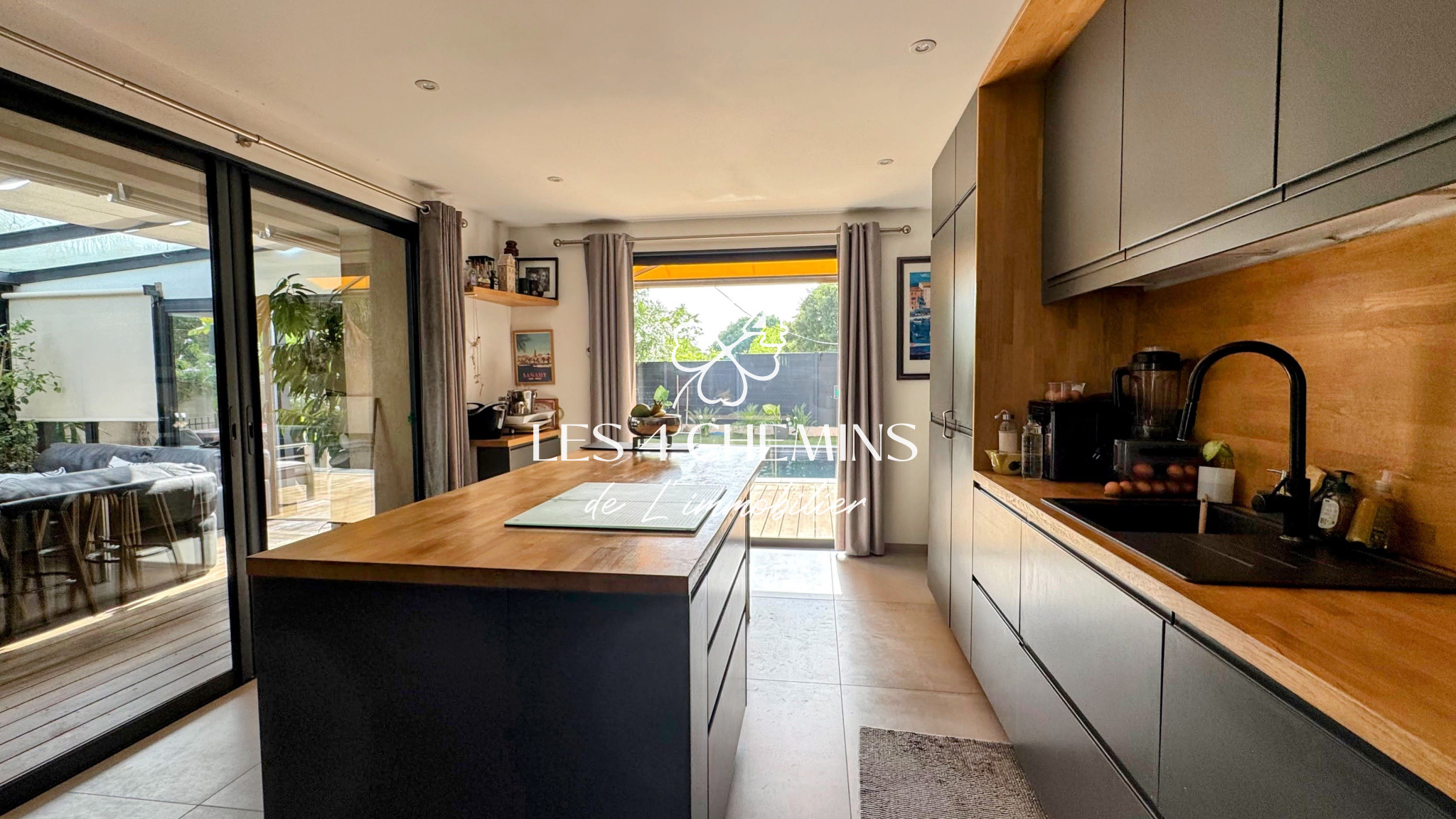 ...Le séjour de 58m2 intégrant la cuisine équipée US avec son piano est ouvert sur une festive...
