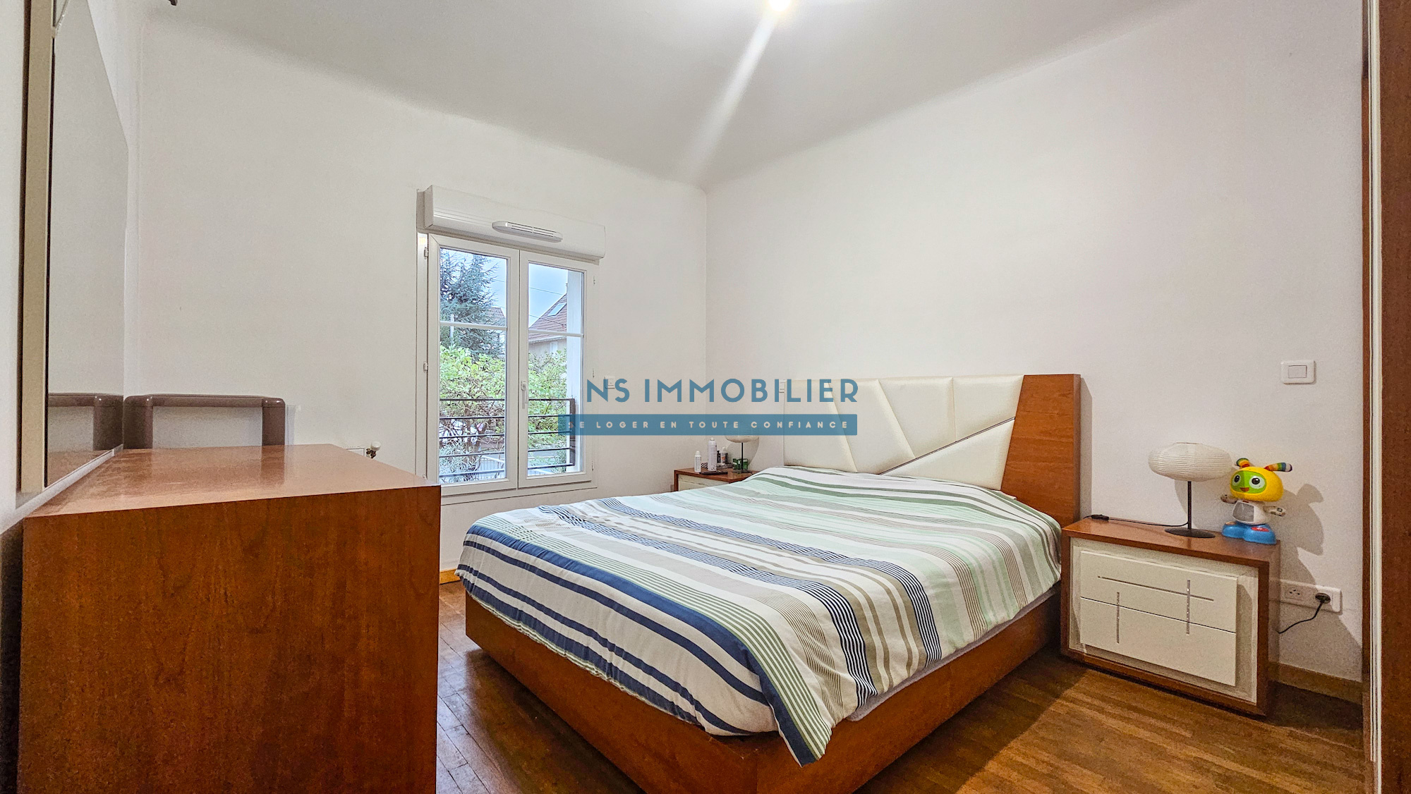 ...A l'étage, on découvre 2 chambres donc une avec un grand espace de rangements, une salle de bain...