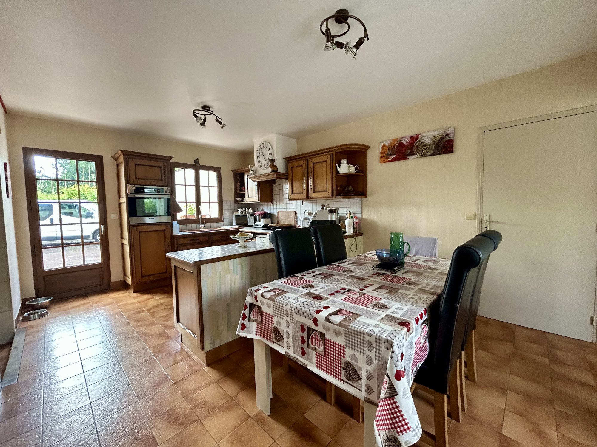 ...Un salon séjour avec un poêle à granulés, ouvert sur une cuisine aménagée et équipée, une véranda...