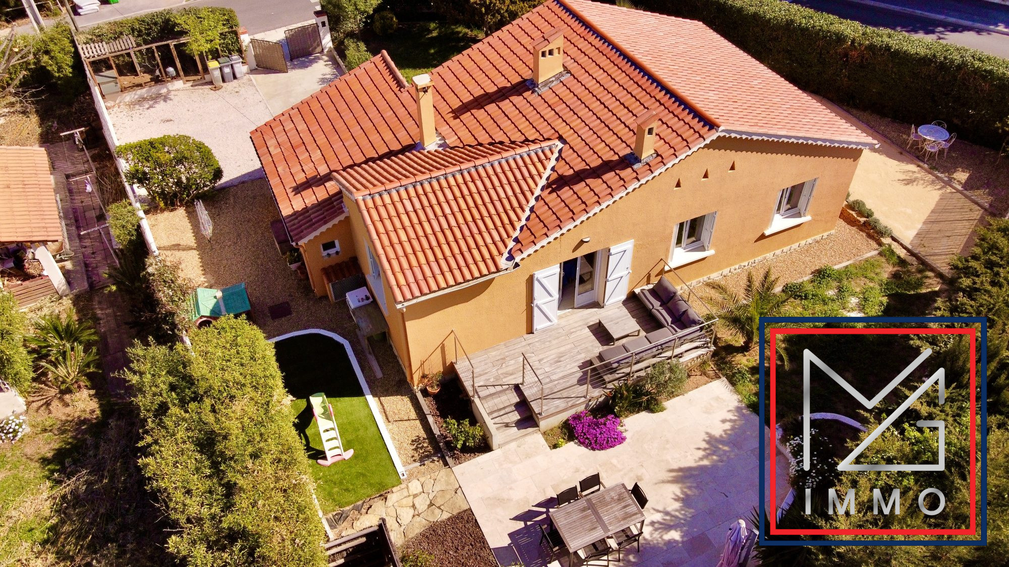 ... avec un jardin arboré d'environ 682M2 paisible, deux terrasses (Sud et Nord), une pergola, et un gr...