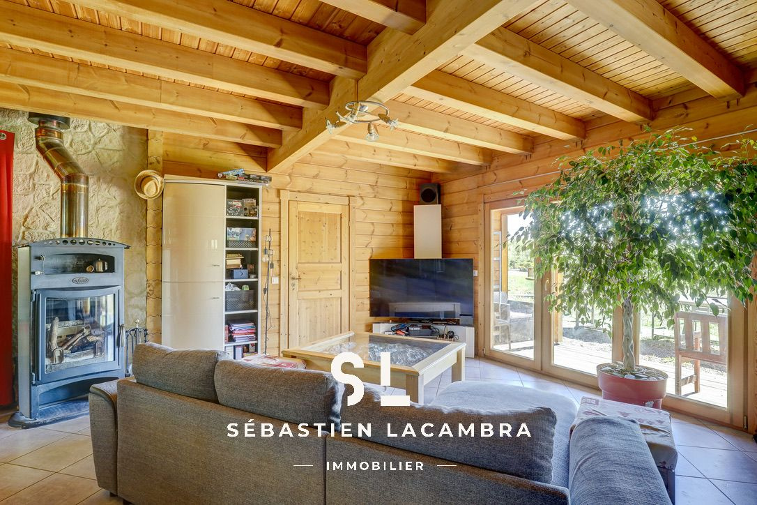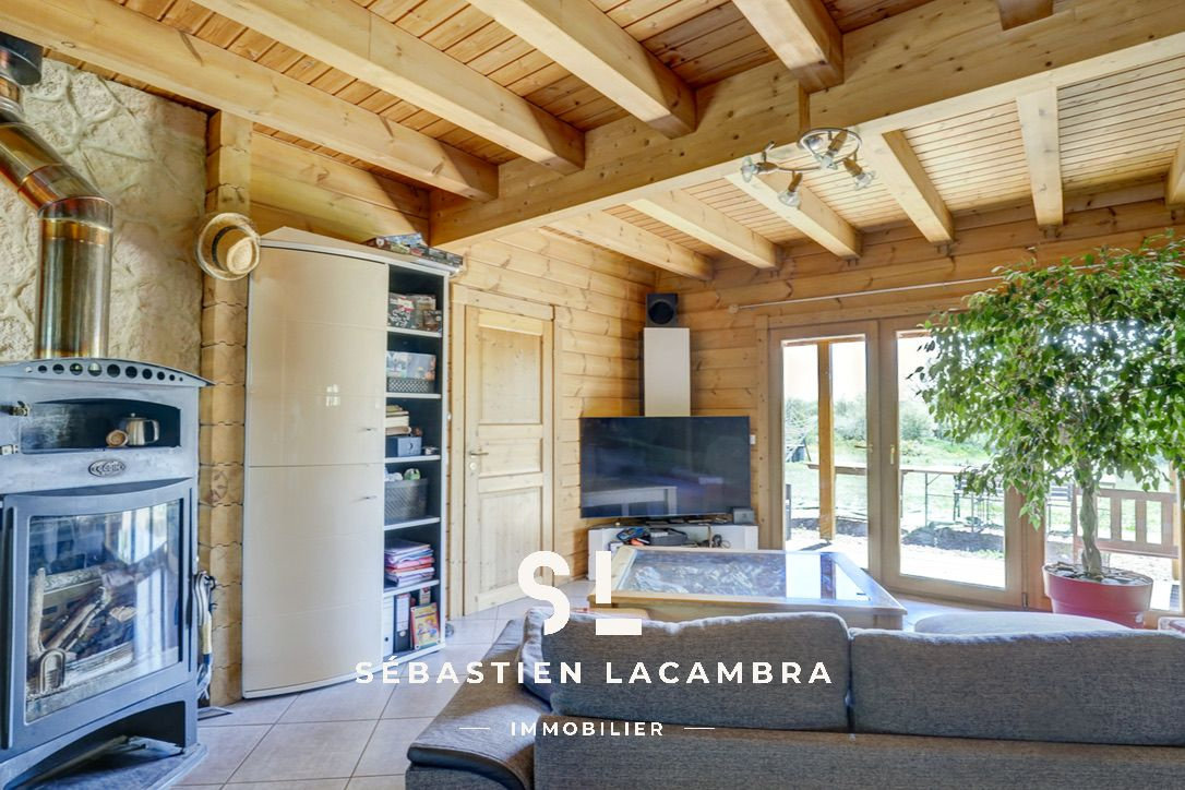 ...Grande pièce principale avec cheminée, terrain de prés de 2000 m²...
