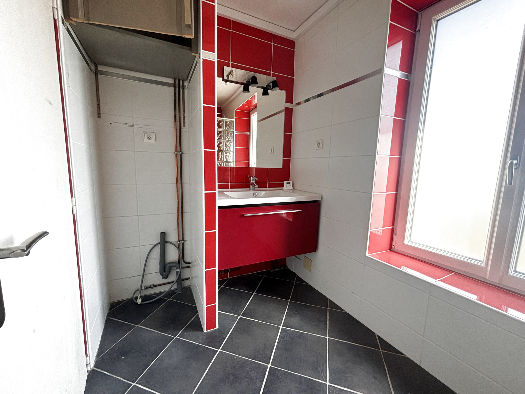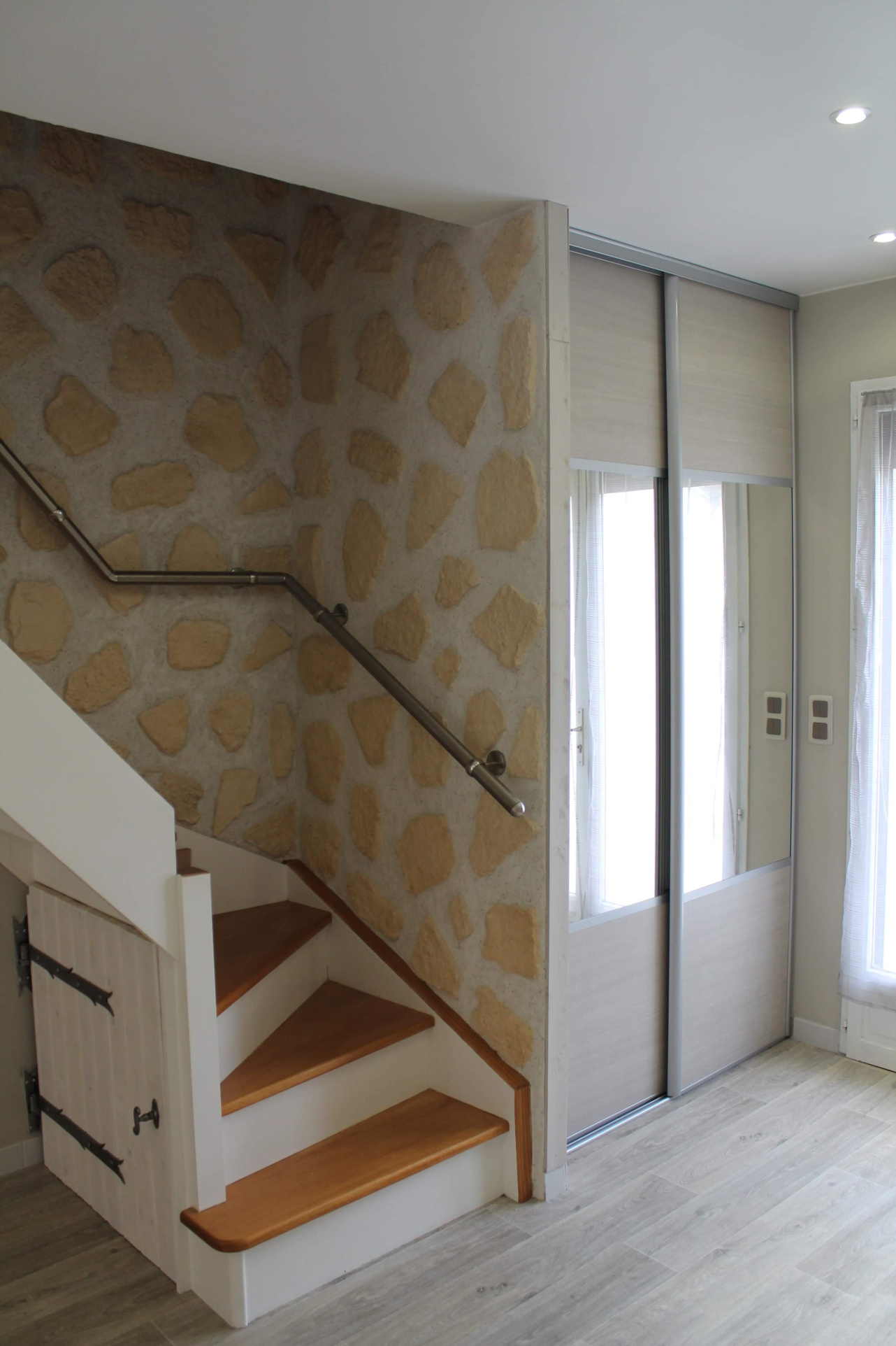 ...Au premier étage : 1 chambre avec rangement, salle de bains avec WC...