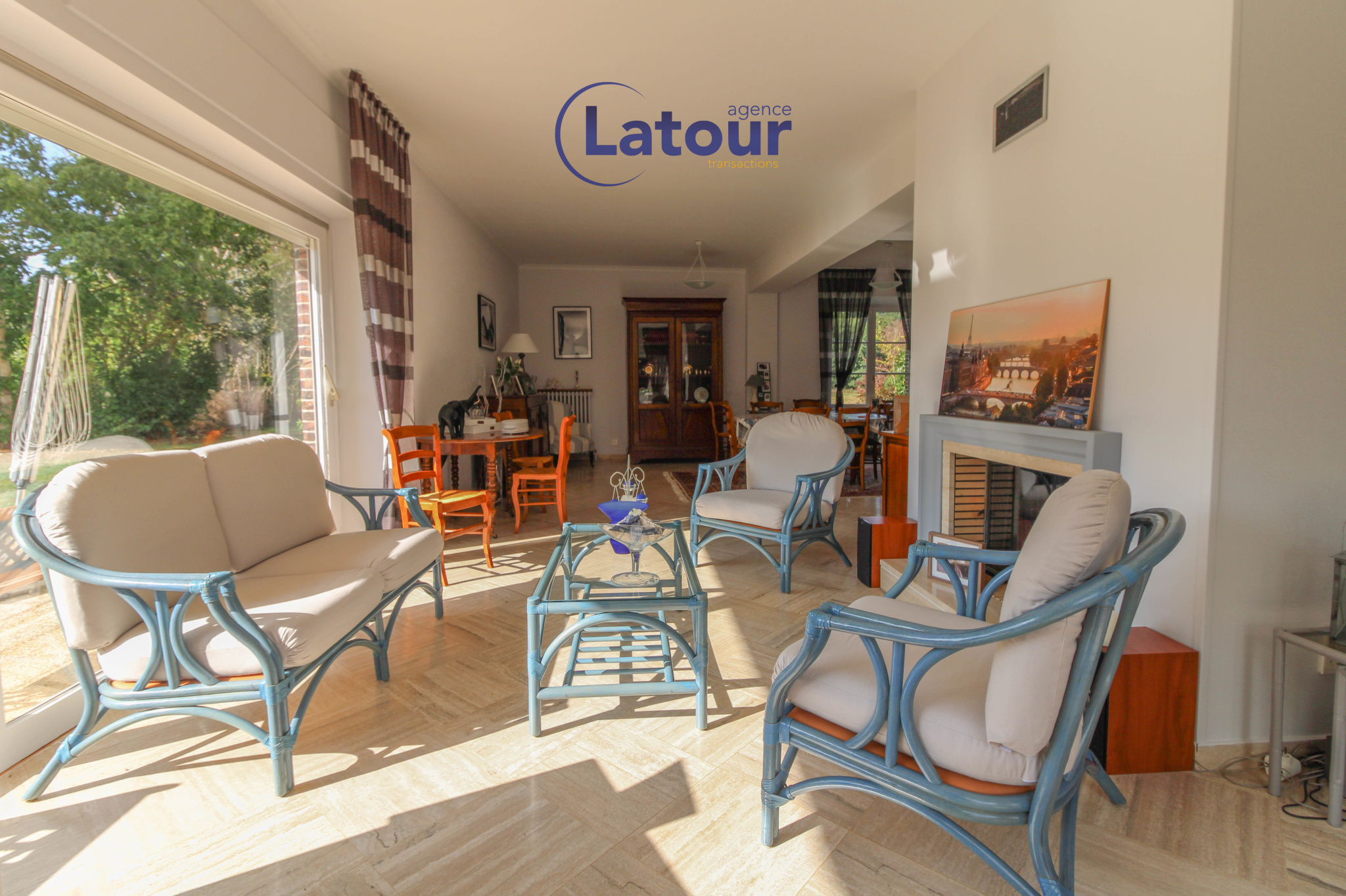 ...comprenant au RDC: deux entrées, une salle à manger avec cheminée, un salon séjour de 63 m2 avec...