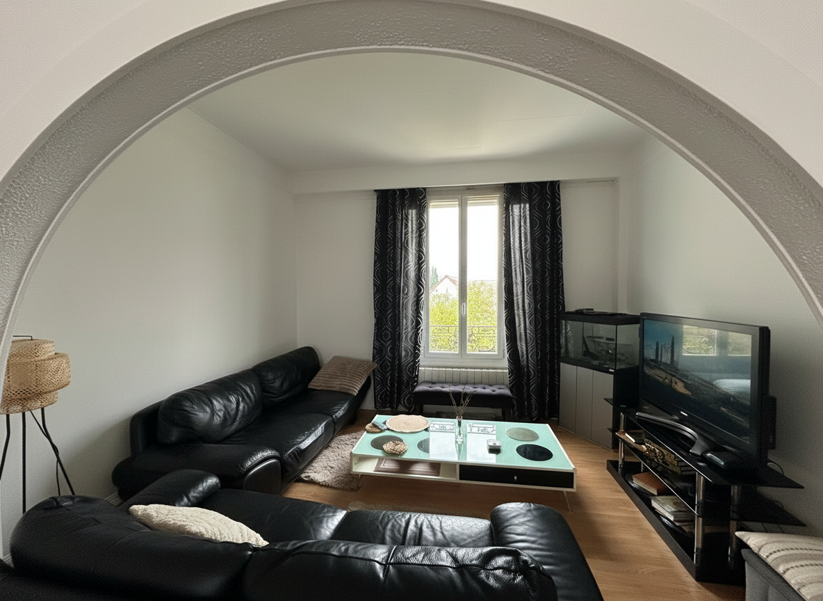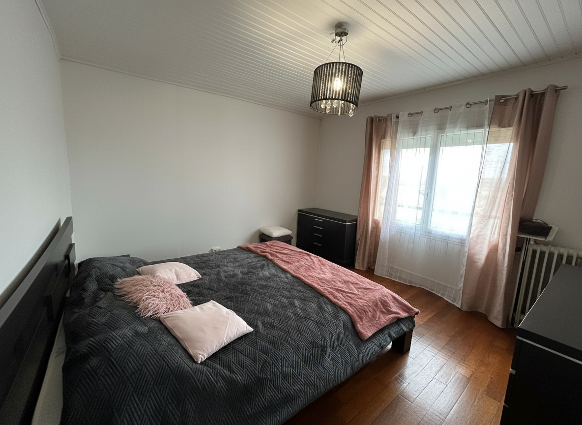 ... un salon lumineux, deux chambres confortables et une salle d'eau, formant un intérieur chaleureux e...