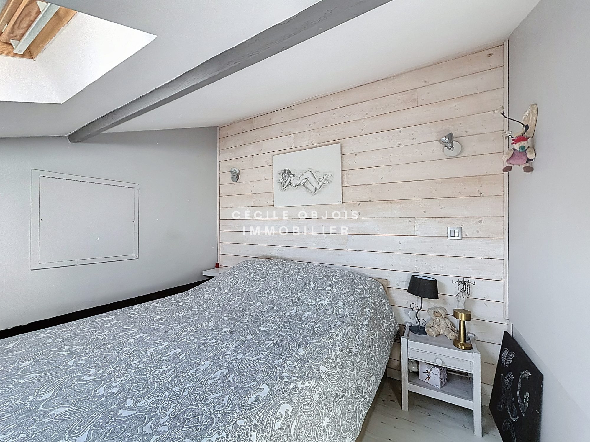 ... l'étage : Grande mezzanine (ou chambre), dégagement avec de nombreux placards, deux chambres, point...