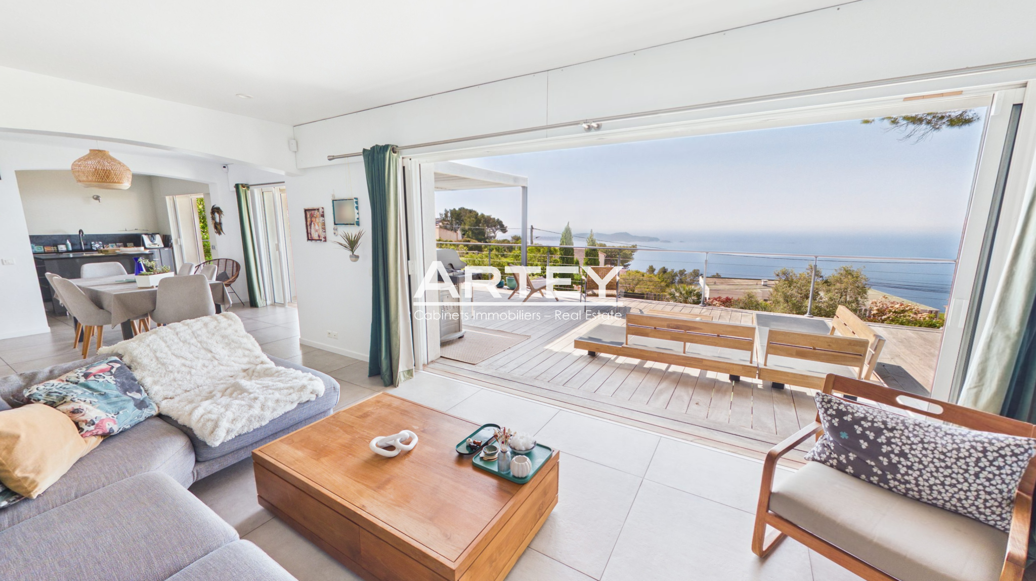 ... un vaste séjour lumineux prolongé par une terrasse avec vue mer. Un salon pouvant être aménagé en s...