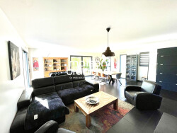 ...Au premier étage, l'espace de vie traversant propose un salon séjour contemporain de 40m2 ouvert...