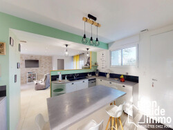 Séjour lumineux semi-ouvert sur une cuisine aménagée et équipée