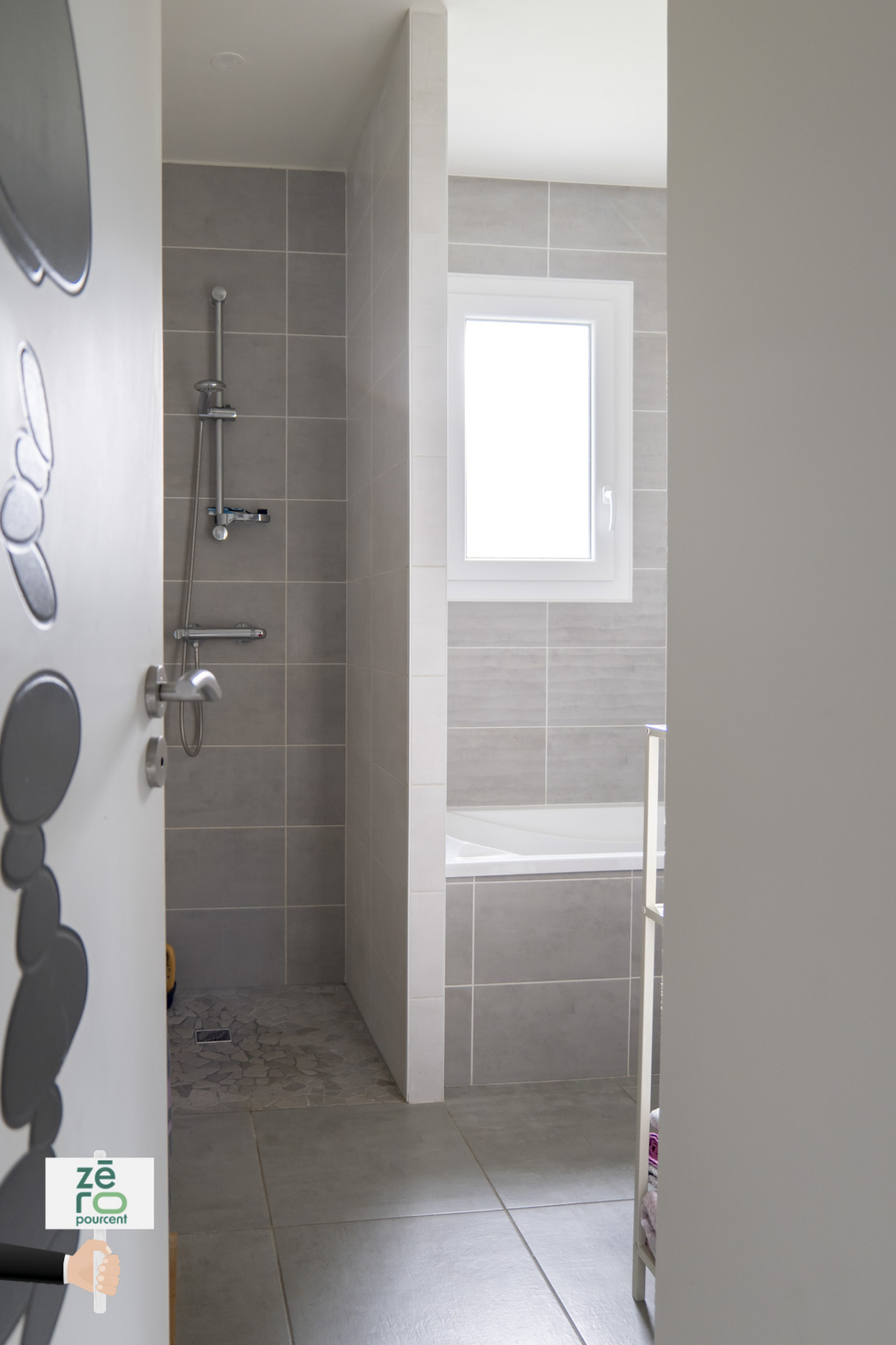 ... de bain moderne équipée d'une douche à l'italienne, d'un meuble vasque en bois et d'un grand miroir...