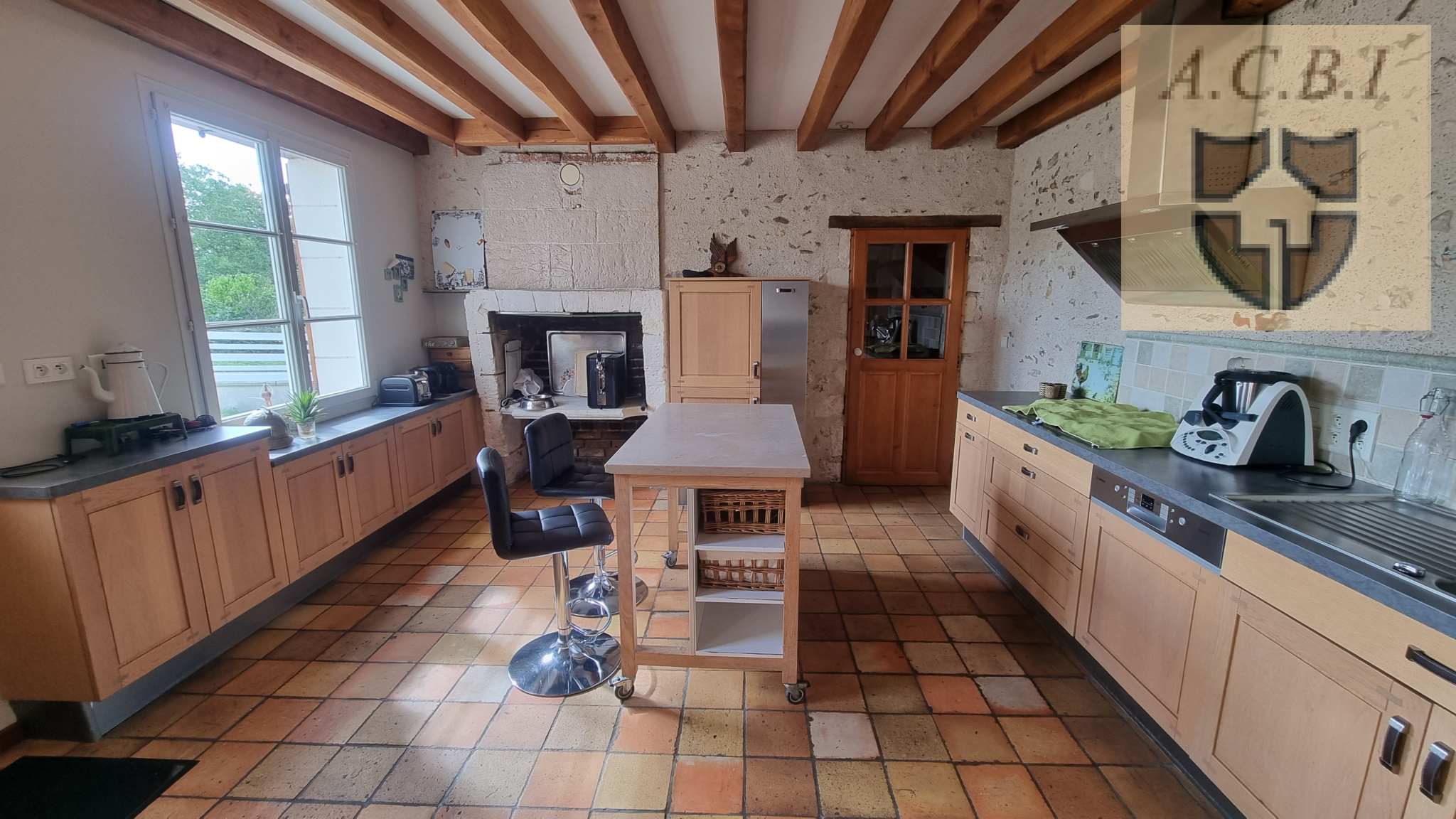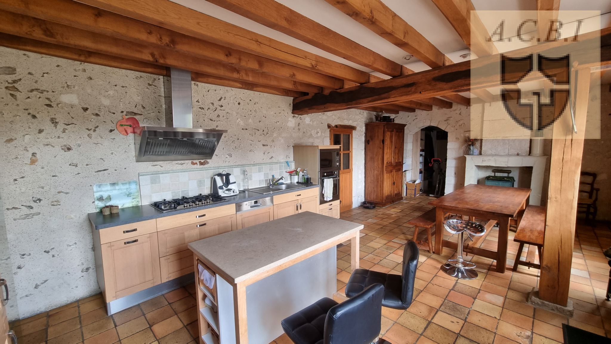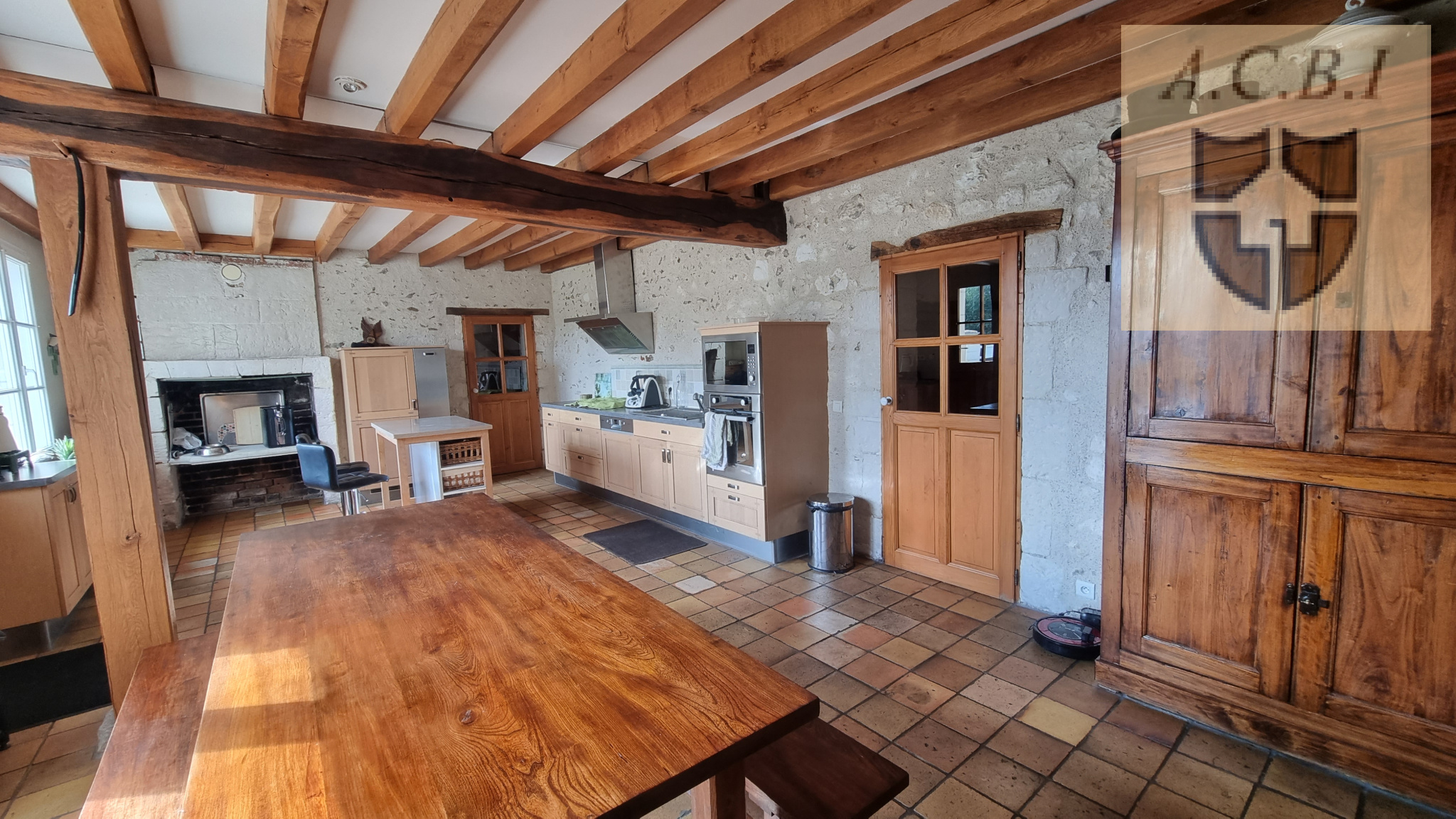 ...Elle se compose : cuisine aménagée equipée ouverte sur séjour avec cheminées, petit salon ,...