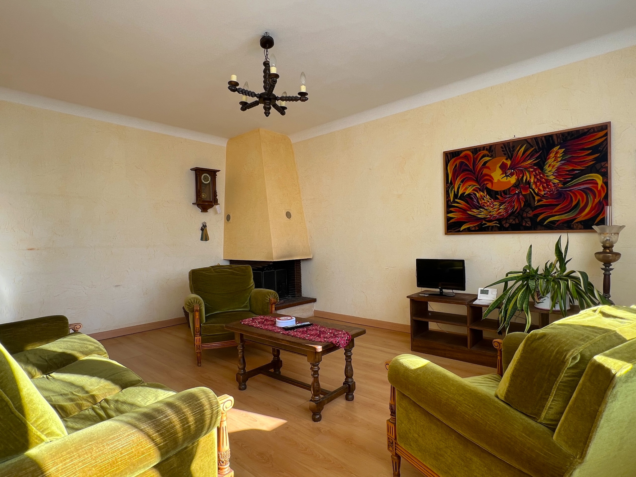 ... salon-séjour lumineux avec cheminée à foyer ouvert et accès direct à la terrasse, une cuisine dinat...