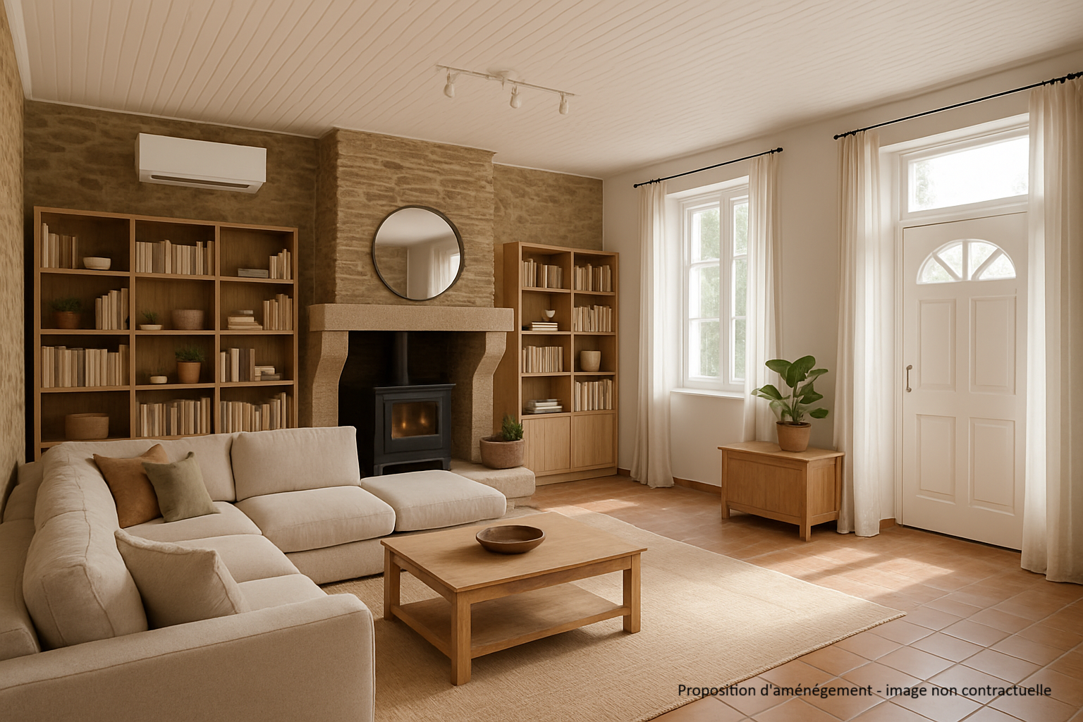...A l'intérieur, vous trouverez une agréable pièce de vie avec insert bois, cuisine ouverte équipée...