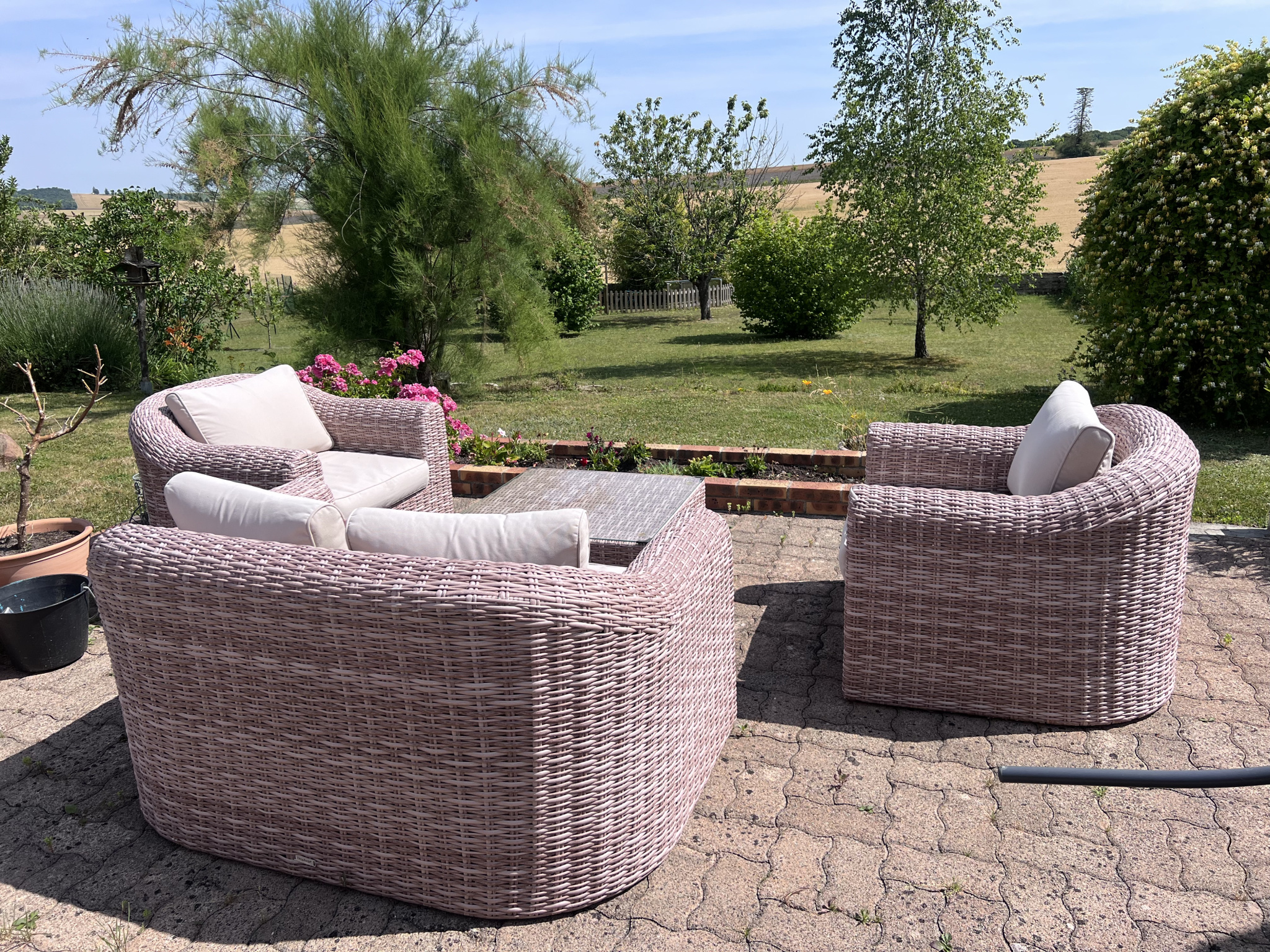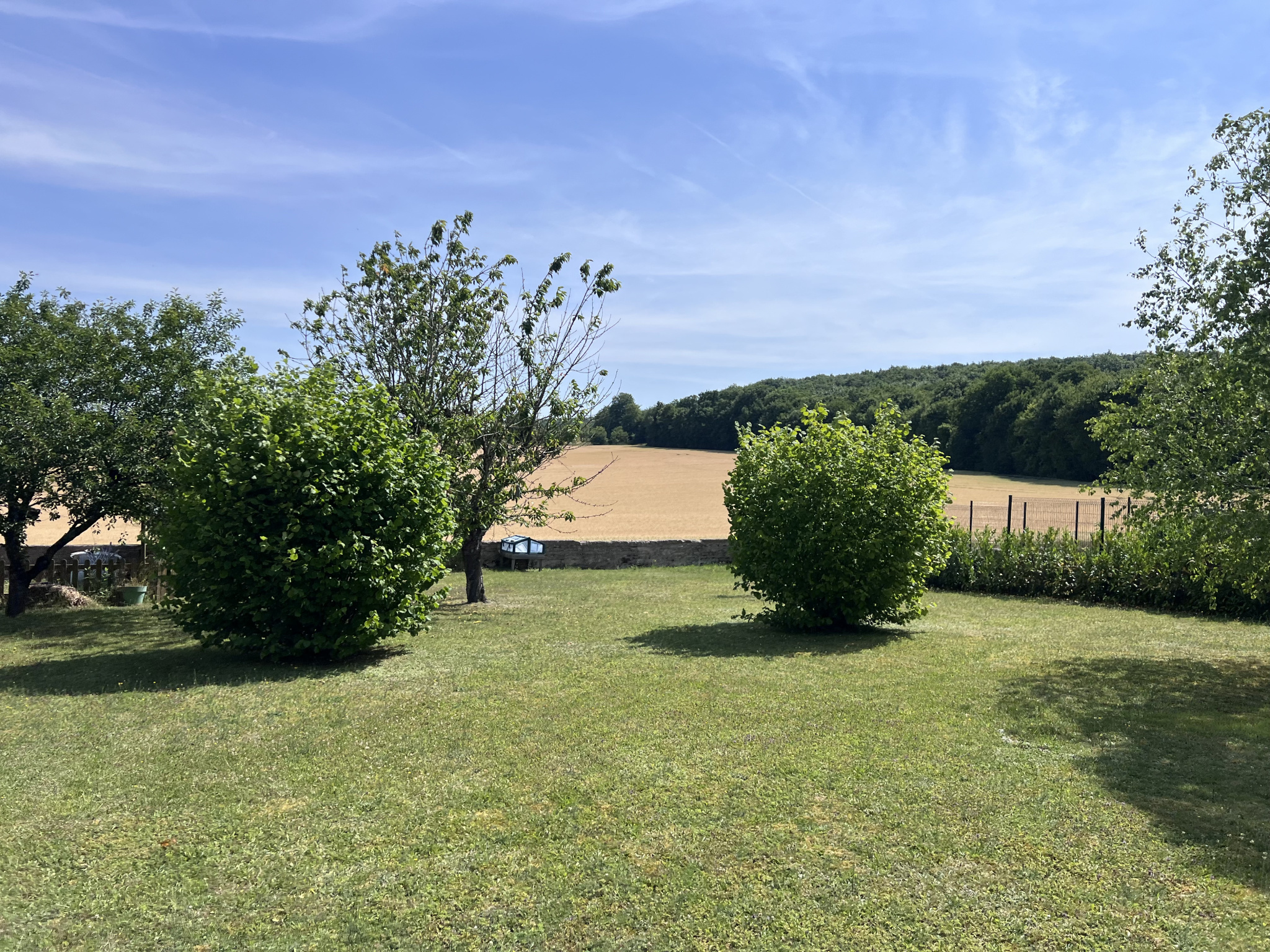 ... terrain clos et arboré de 1 500 m2 avec vue dégagée sur la campagne.