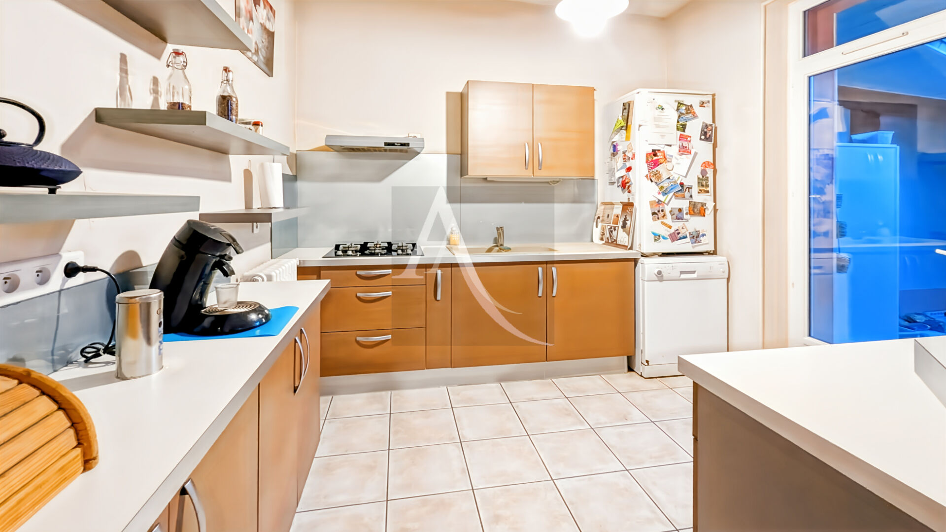... : un salon lumineux et spacieux, une cuisine ouverte avec plaque et hotte, un dégagement avec placa...