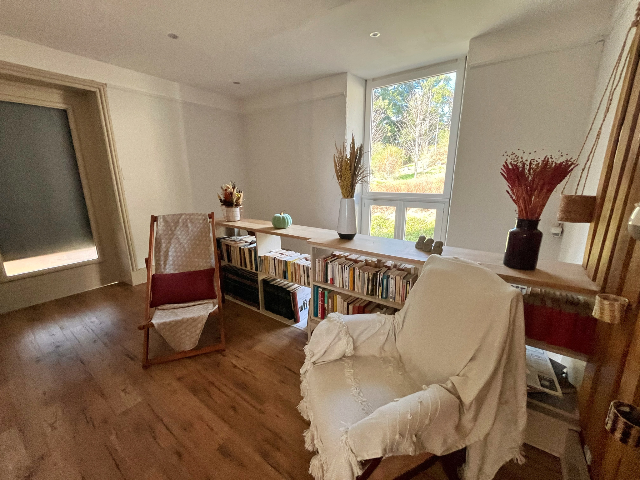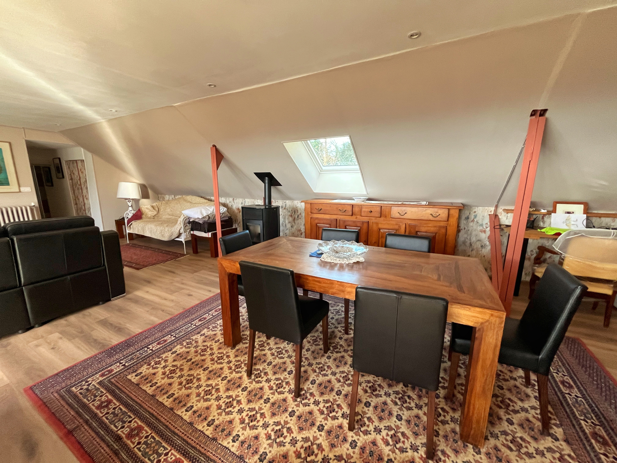 ...Elle comprend une cuisine séparée équipée, une pièce à vivre lumineuse avec cheminée donnant...