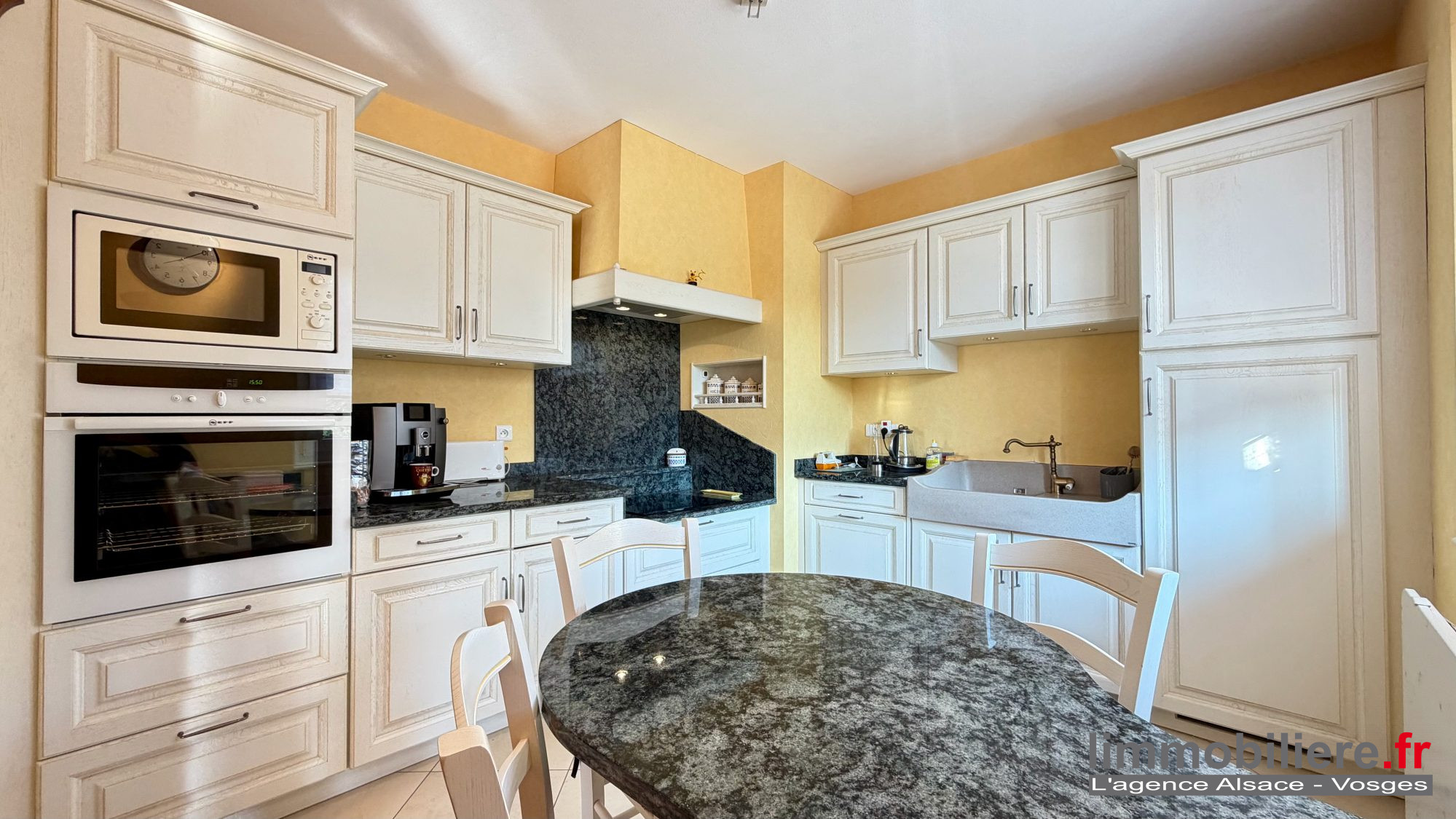 ... une cheminée, une cuisine équipée avec plan de travail en granit, deux chambres avec dressing, une ...