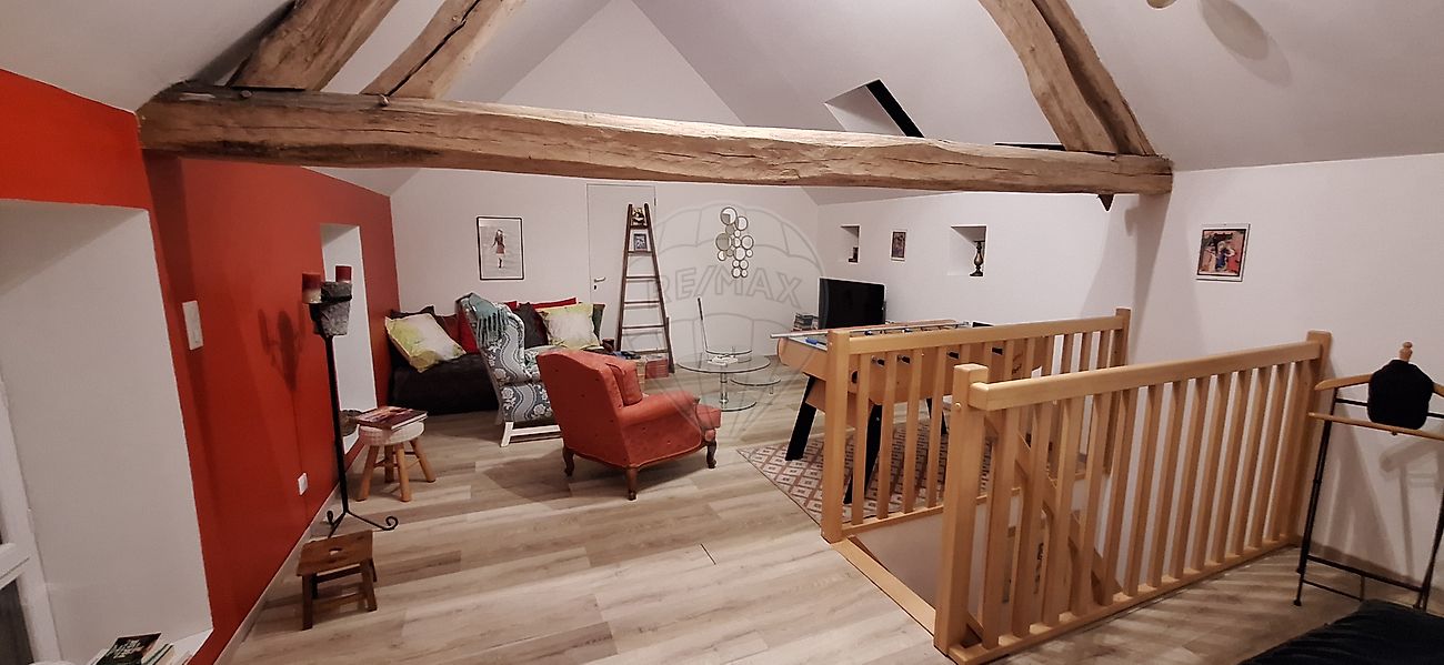 ...Elle se compose au rez-de-chaussée d'un salon/salle à manger avec poutres apparentes et cheminée...