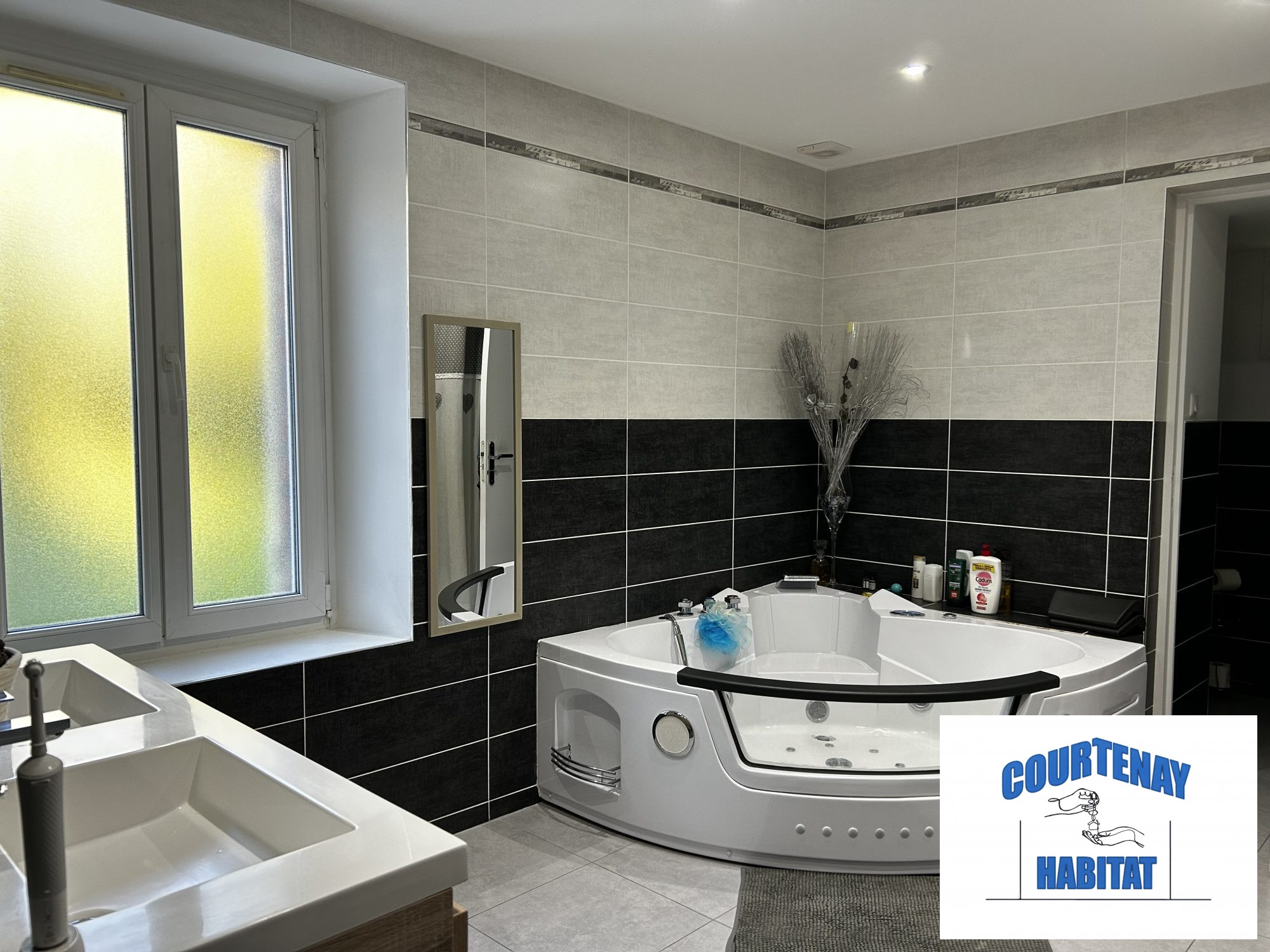 ... conduit au palier mezzanine distribuant quatre grandes chambres, dont deux avec coin douche et meub...