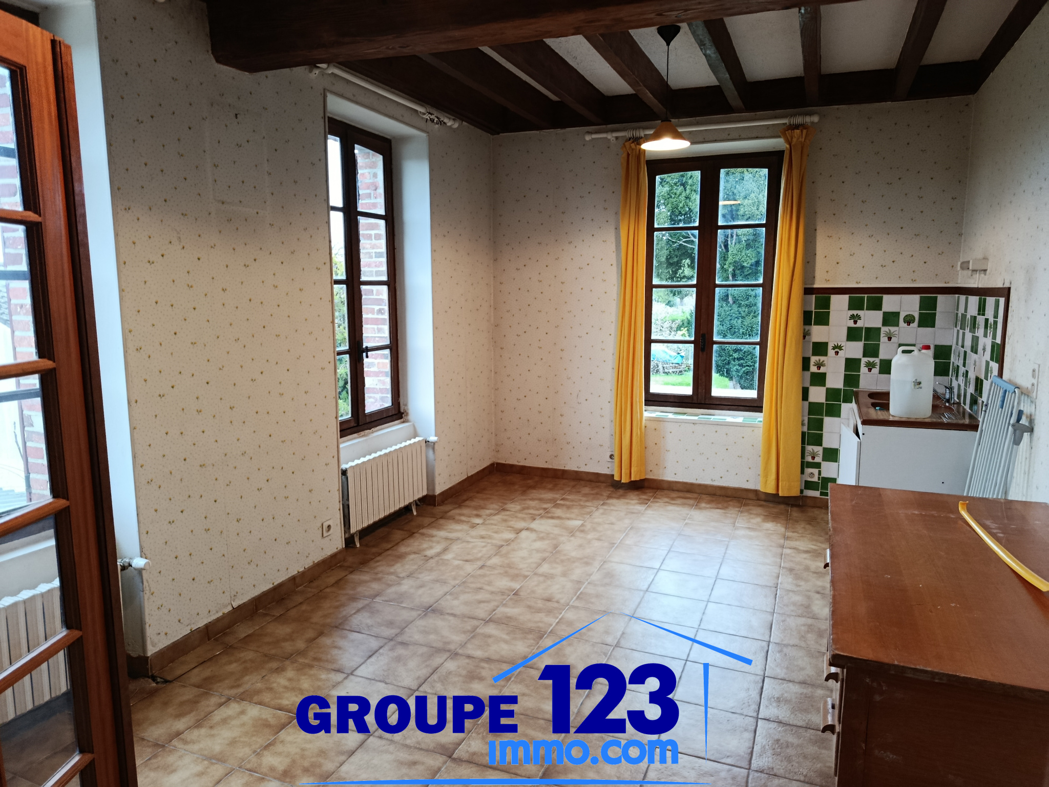 ...Au rez-de-chaussée, la grande piéce de vie d'environ 80 m2, traversante avec sa cheminée foyer...