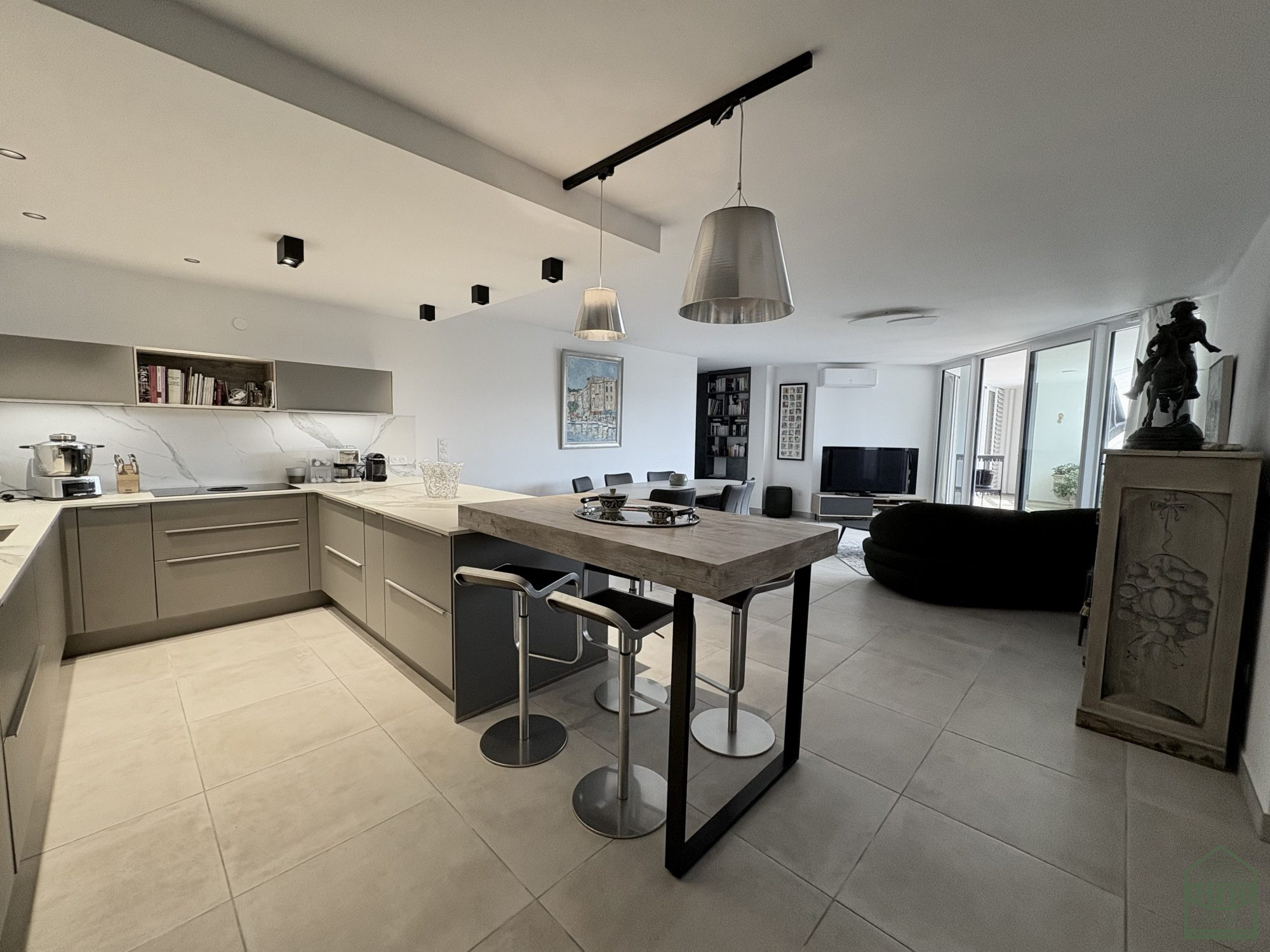 Ce bien d'exception se compose d'un vaste séjour lumineux de plus de 40 m² avec cuisine ouverte entièrement équipée, offrant un espace de vie spacieux et convivial.