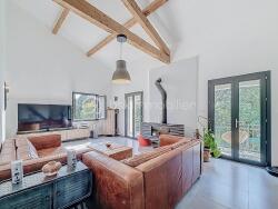 La maison se compose d'une entrée qui dessert la salle à manger avec cuisine américaine, ouverte sur la terrasse et le jardin, d'un séjour cathédrale baigné de lumière avec un espace salle de sport (ou possibilité de créer une quatrième chambre), d'une mezzanine ouverte sur le séjour (servant actuellement de chambre d'appoint), de trois chambres avec placards dont une avec salle d'eau, d'une salle de bain et d'un WC indépendant.