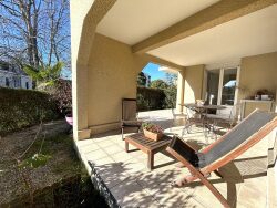 Avenue des Lilas, dans une résidence sécurisée, au rez-de-chaussée, cet appartement comprend : Une entrée, un salon séjour donnant sur la TERRASSE COUVERTE ET LE JARDIN, une cuisine ouverte équipée ( four, plaque électrique, machine à laver, hotte, lave vaisselle, réfrigérateur), deux chambres avec placard, une salle de bains (baignoire, meuble vasque), une buanderie et des toilettes indépendantes.