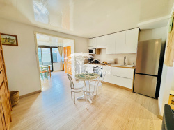 Cuisine moderne entièrement équipée ouverte sur une belle pièce de vie lumineuse prolongée par une loggia,